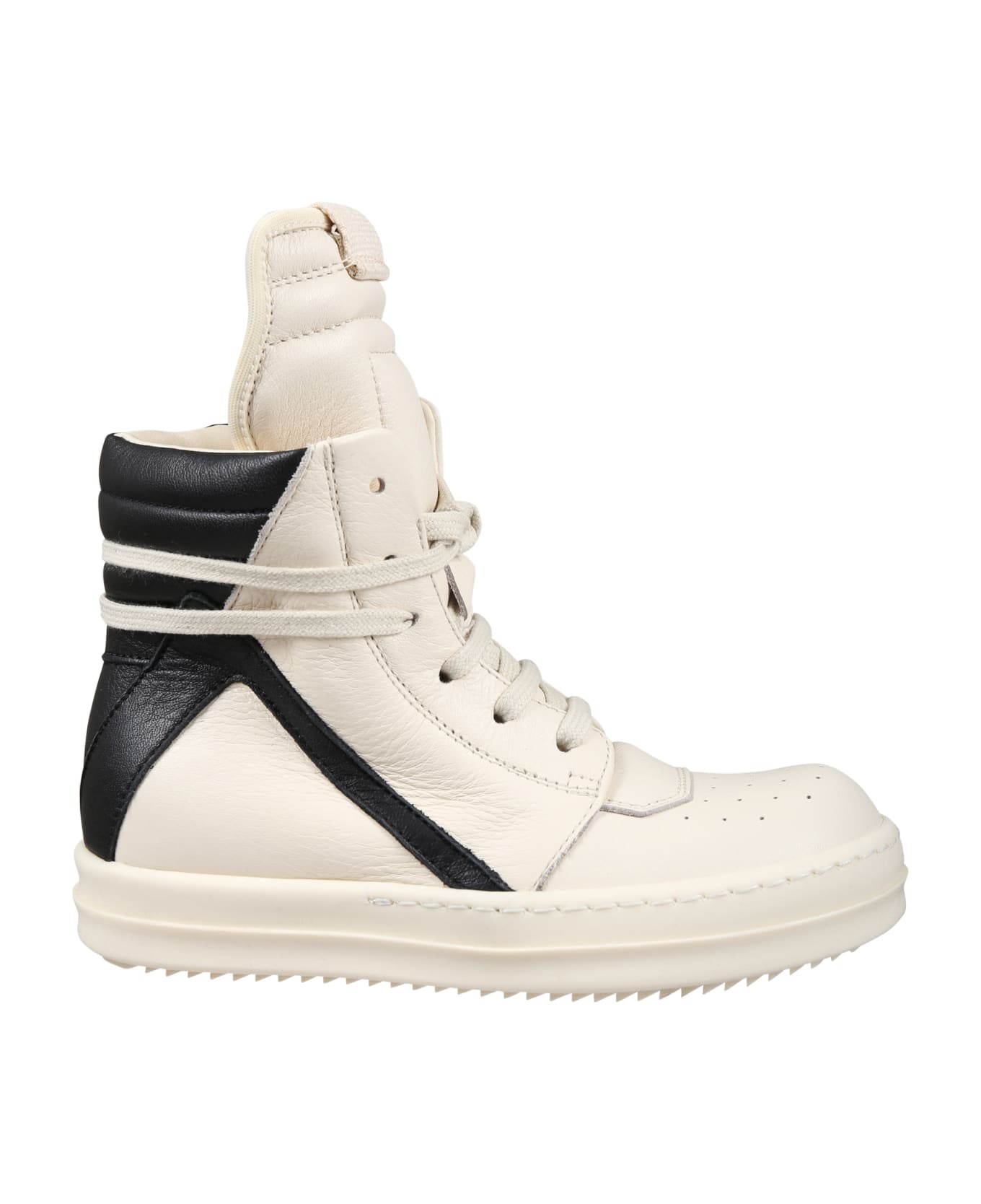 High-top beige sneakers, with beige rubber sole, lace-up and side zip closure, elongated tongues. They are embellished with black details.