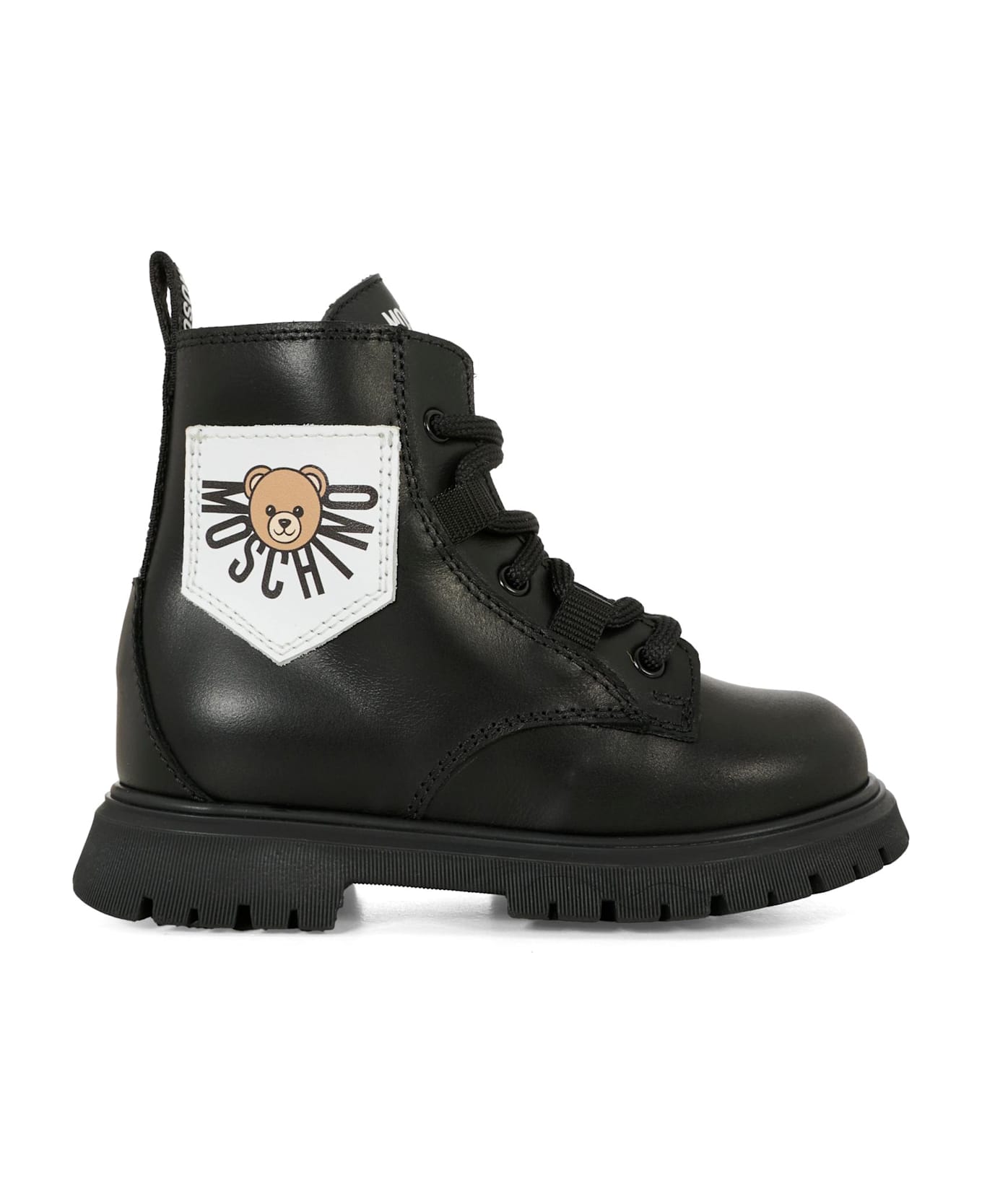 Black leather ankle boots, with rubber sole, side zip fastening, laces, round toe and logo tongue on the back. They are embellished with a white patch with Teddy Bear and logo, on one side.