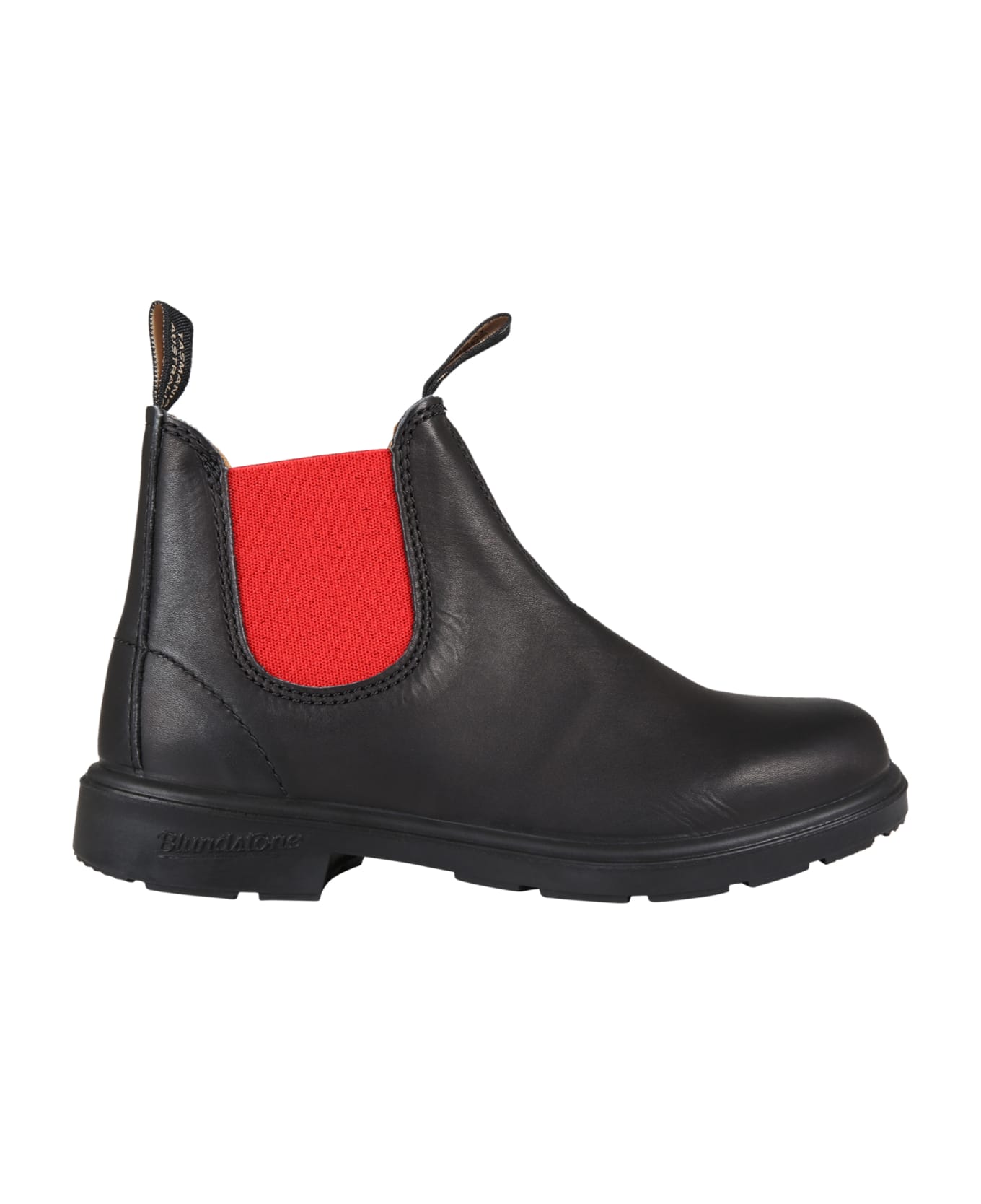 Black leather boots, with rubber sole and red elasticated rips on the sides. They are embellished with logoed tabs, on the front and back.