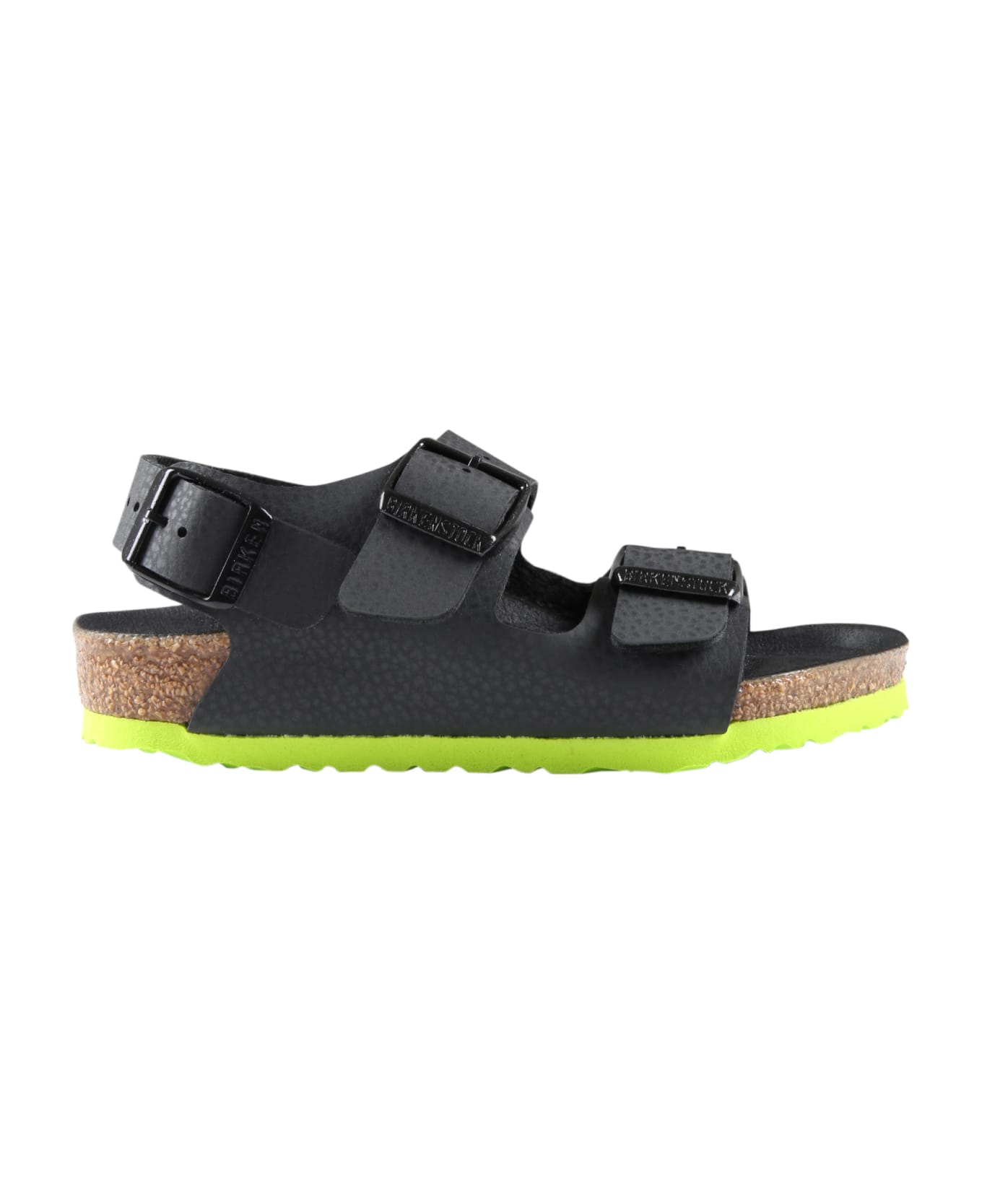 Black sandals with two straps with adjustable buckles on the front and heel strap. They are embellished with green sole and embossed logo on the side.