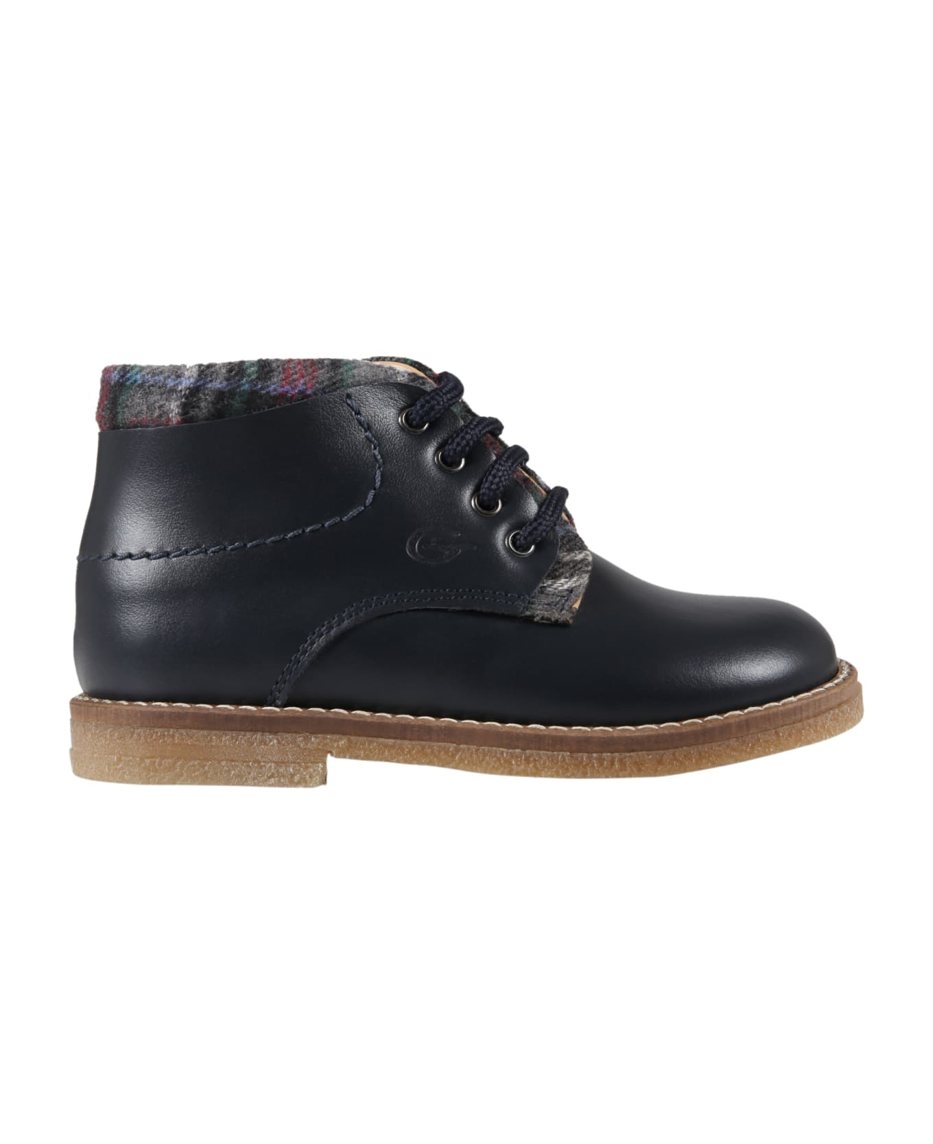 Blue leather ankle boots, with rubber sole and lace-up closure on the front. They are embellished with multicolor checked details and logo, on the side.