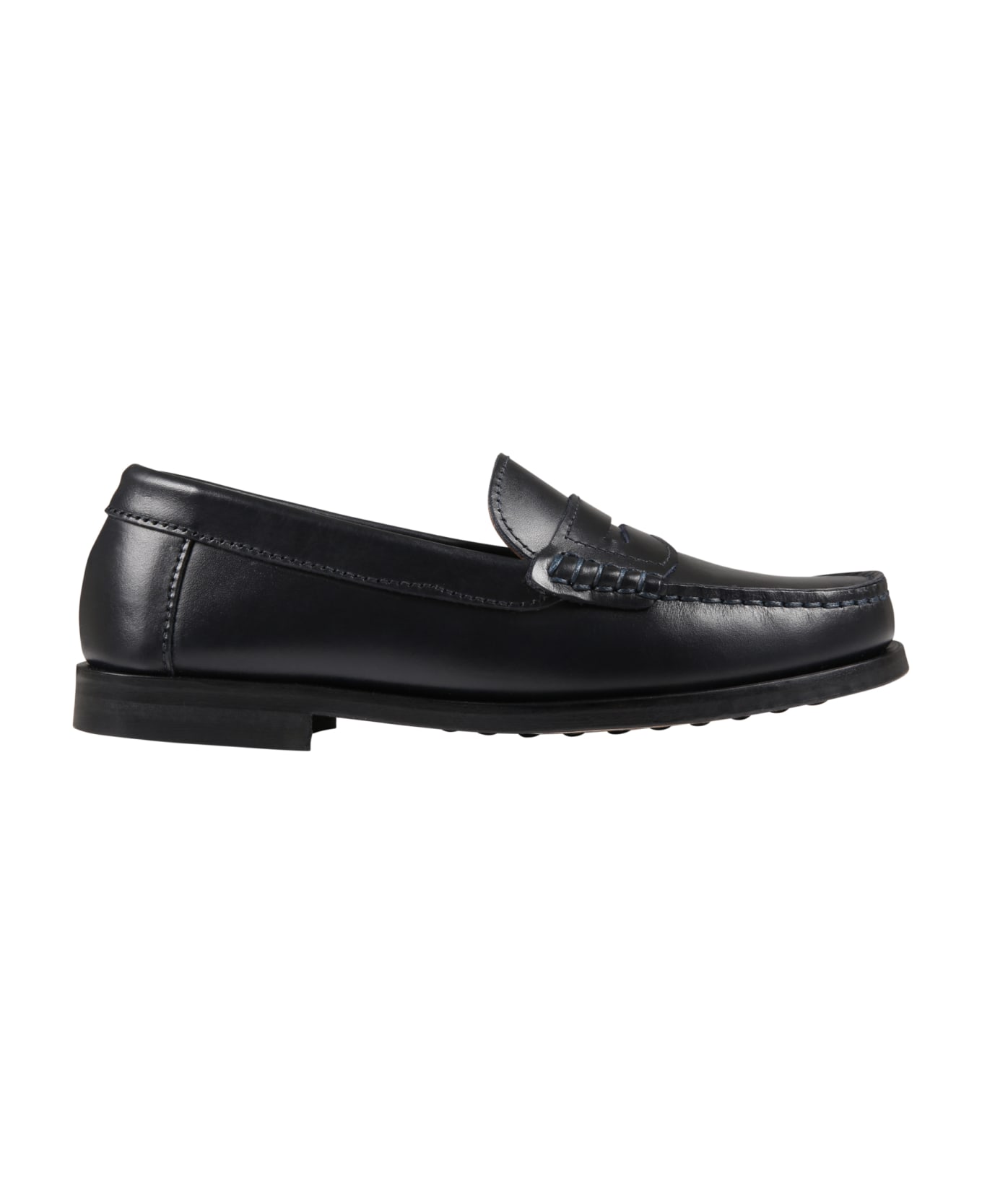 Blue leather loafers, with non-slip leather sole and low heel. They are embellished with stitching.