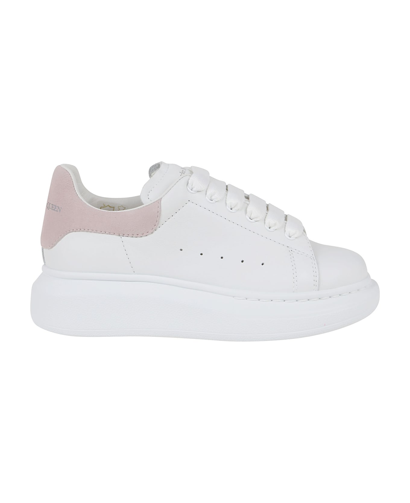 Oversized sneakers in white calfskin, oversize tone-on-tone sole, flat laces. Featuring a mustache on the back in nude velvet with silver Alexander McQueen engraving also on the front tongue. A true brand must, present in all seasons with the color variant!