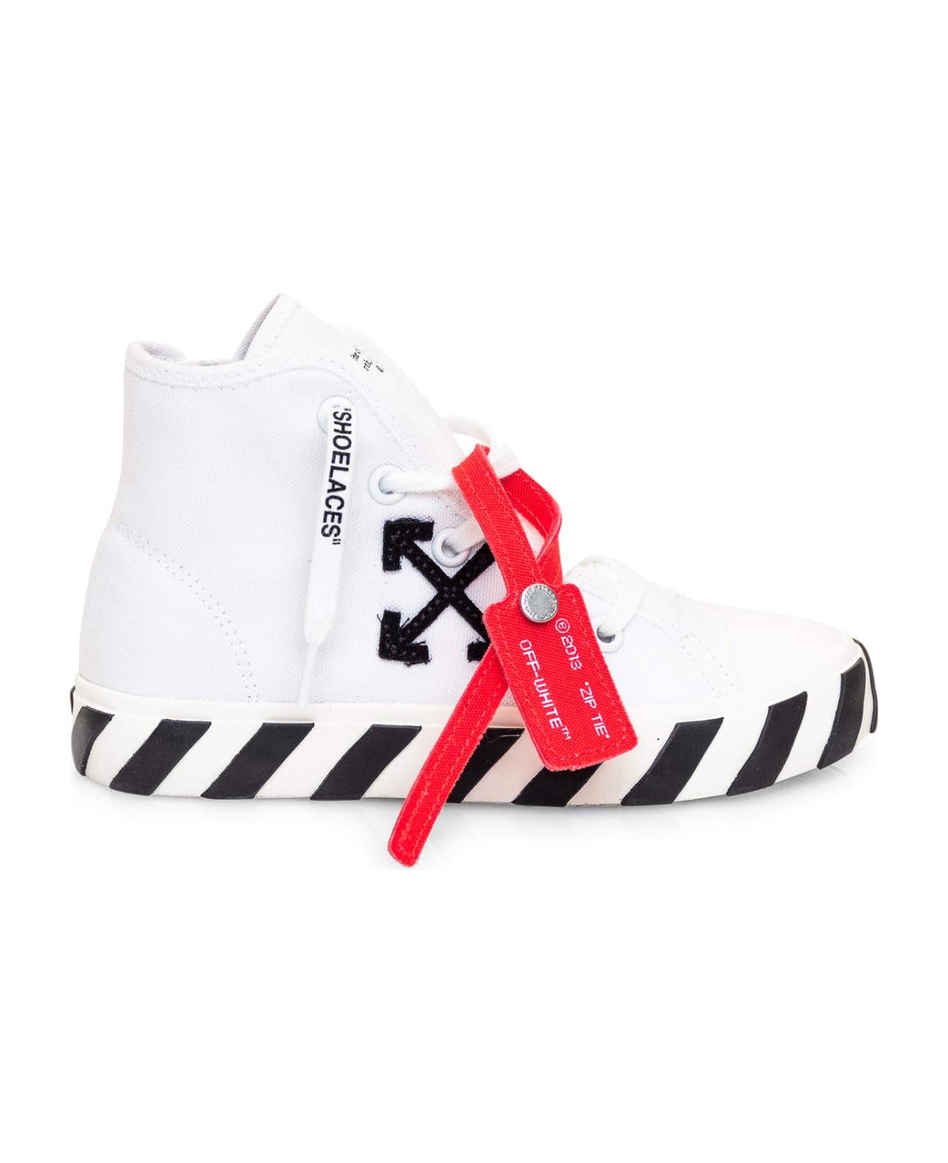 Mid top white sneaker. Lace-up closure. Zip on the side. Arrow patch on the side. Logo on the tongue.
