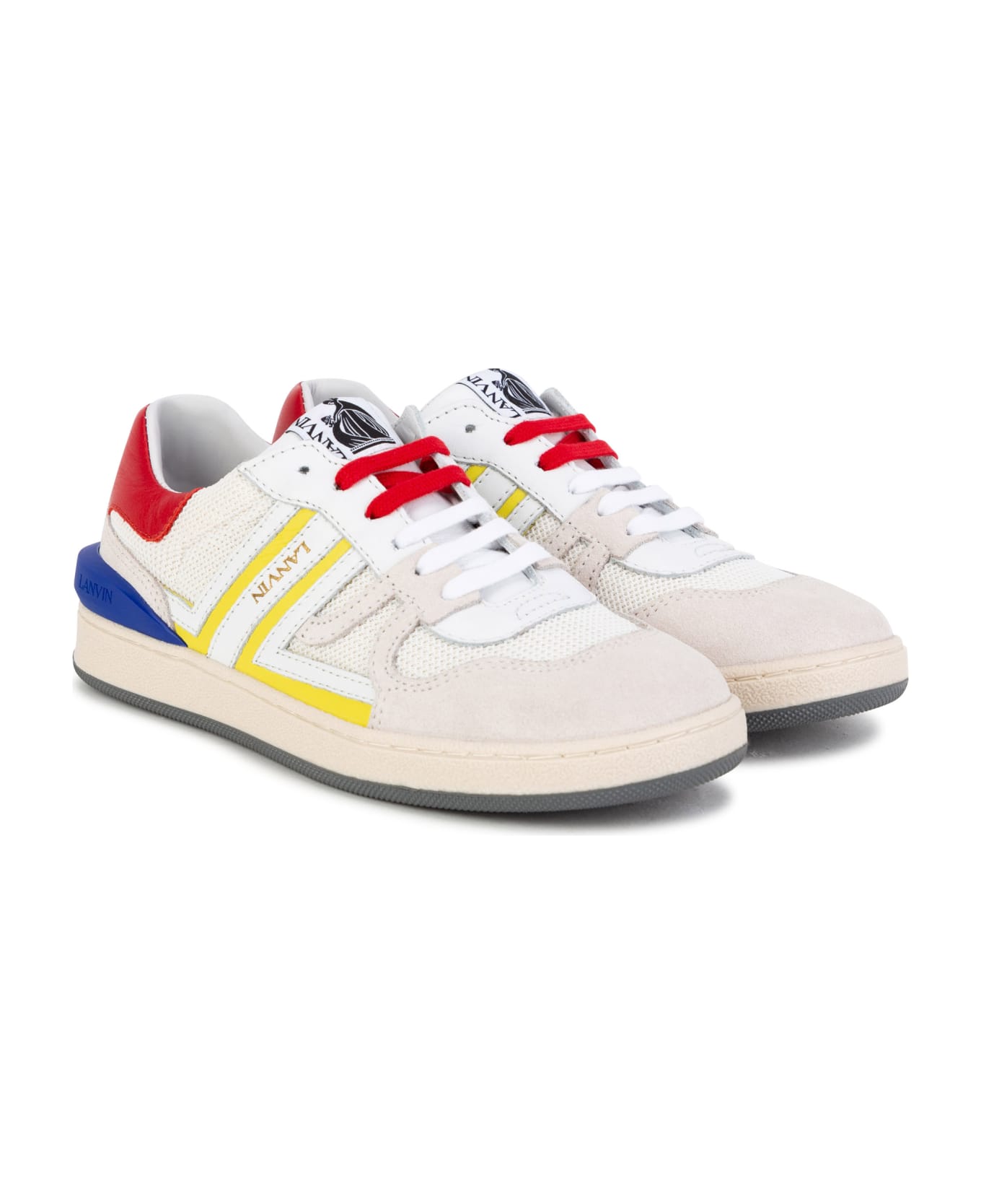 White/multciolour leather logo-embossed low-top leather sneakers from LANVIN Enfant featuring colour-block panelled design, embossed logo to the side, logo patch at the tongue, round toe, front lace-up fastening, branded insole and flat rubber sole. Composition: Pelle