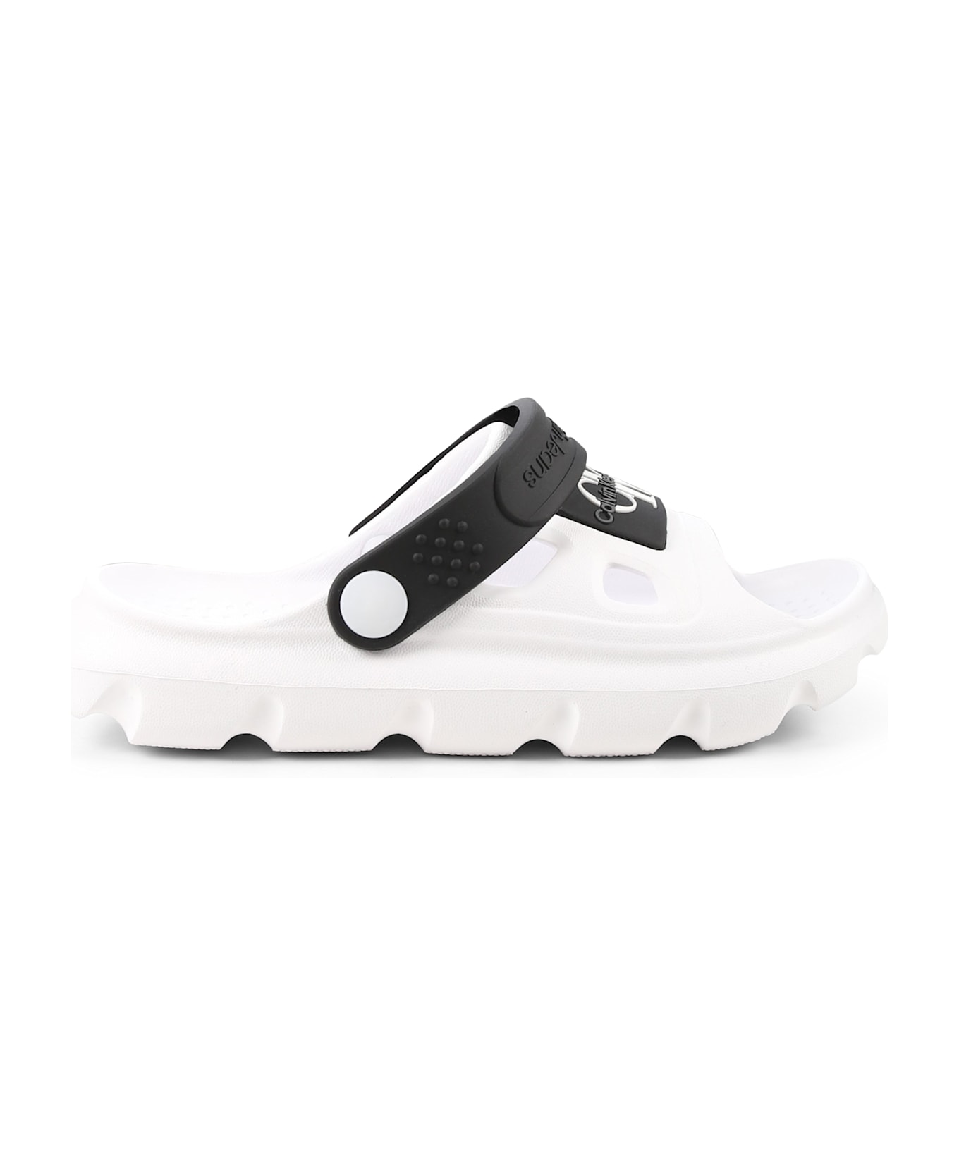 White sandals with rubber sole and black strap on the heel. They are embellished with a black logo on the front.