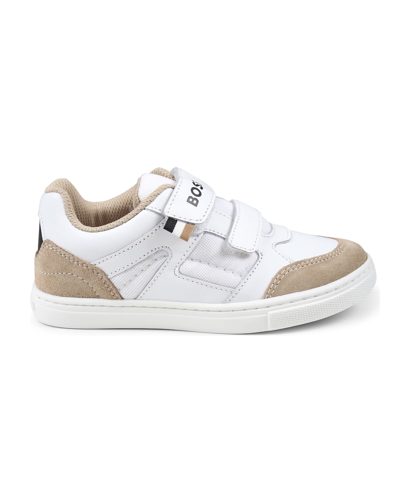 White leather sneakers, with rubber sole, velcro fastening, round toe and beige suede inserts. They are embellished with logo on the front and patch.
