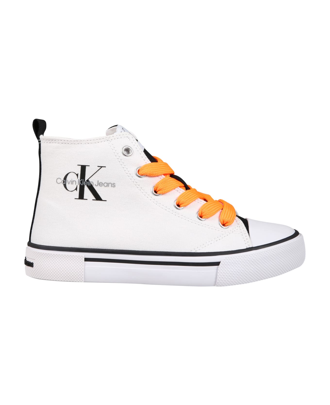 White high-top sneakers, with rubber sole, round rubber toe, side zip and velcro closure, with laces on the top, come with double laces, one white, the other orange. They are embellished with logo on the side and on the heel.