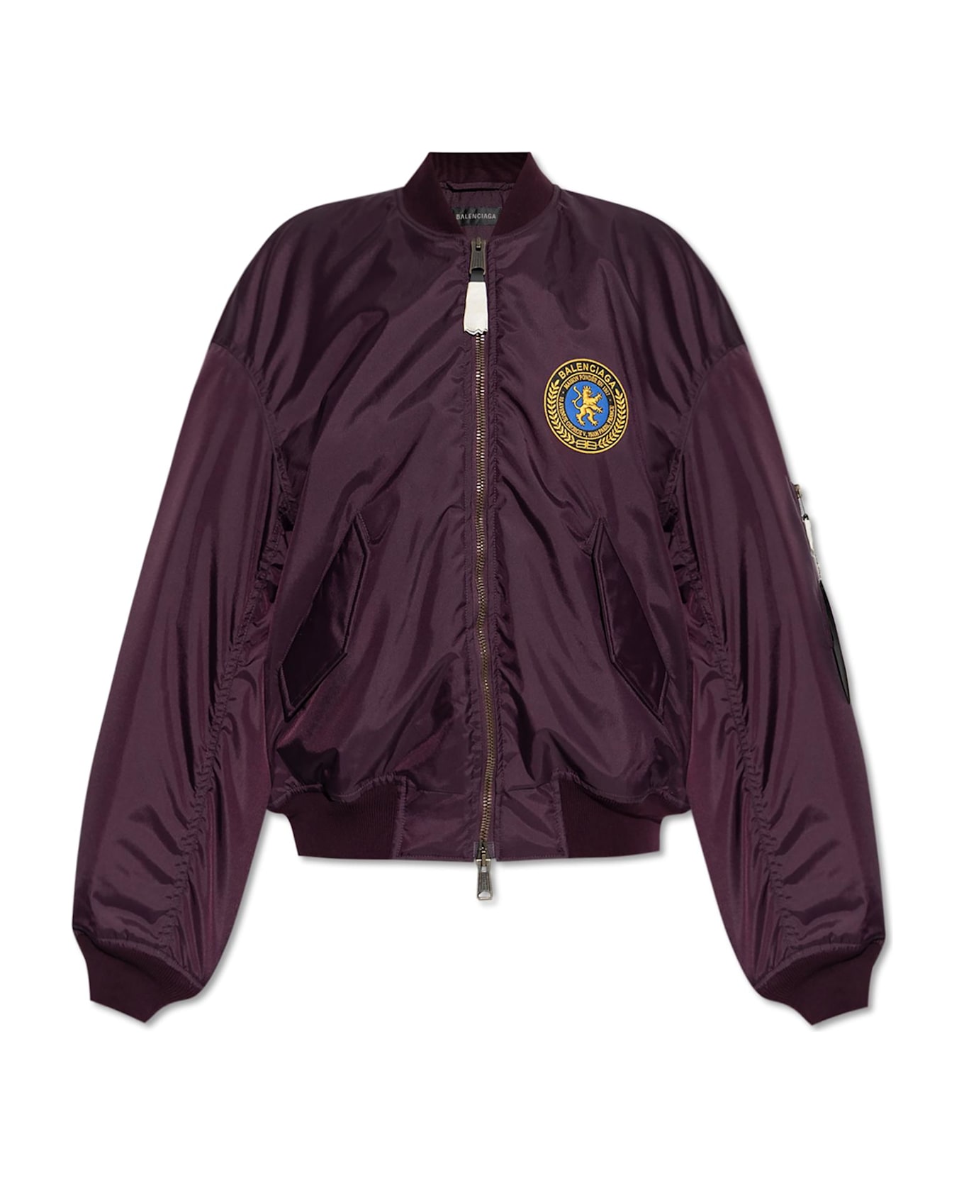 Experience an elevated interpretation of casual luxury with this striking bomber jacket by Balenciaga. Rendered in a deep bordeaux hue, its lustrous technical fabric captures the essence of modern sportswear while exuding sophisticated appeal. The oversized silhouette, complete with elongated, ruched sleeves and finely ribbed cuffs and hem, creates a bold yet refined profile. Minimalist in design, it draws attention to subtle, distinctive details: a round emblem featuring BALENCIAGA on the left chest and a large holographic patch reading Outerwear BALENCIAGA on the sleeve. Polished metallic zipper elements artfully punctuate its streamlined form. Crafted from premium polyamide, this jacket embodies the Maison's marriage of haute couture legacy and contemporary innovation an unmistakable statement for the discerning urban wardrobe. Why choose this product? Exquisite technical fabric with a sophisticated sheen Distinct oversize silhouette with elegant draping Signature designer emblems and holographic details Heritage craftsmanship fused with modern style Statement piece from an iconic French fashion house