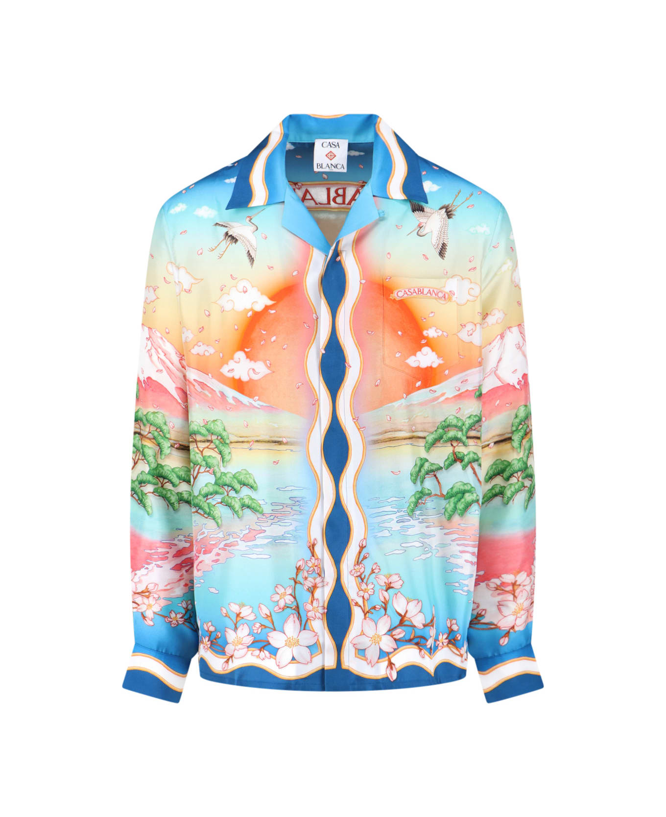 Casablanca 'Tennis Club' shirt in light blue silk with multicolor print pattern, classic lapels, button closure, chest patch pocket, logo lettering on the chest, button cuffs, straight hem. Composition: 100% Silk