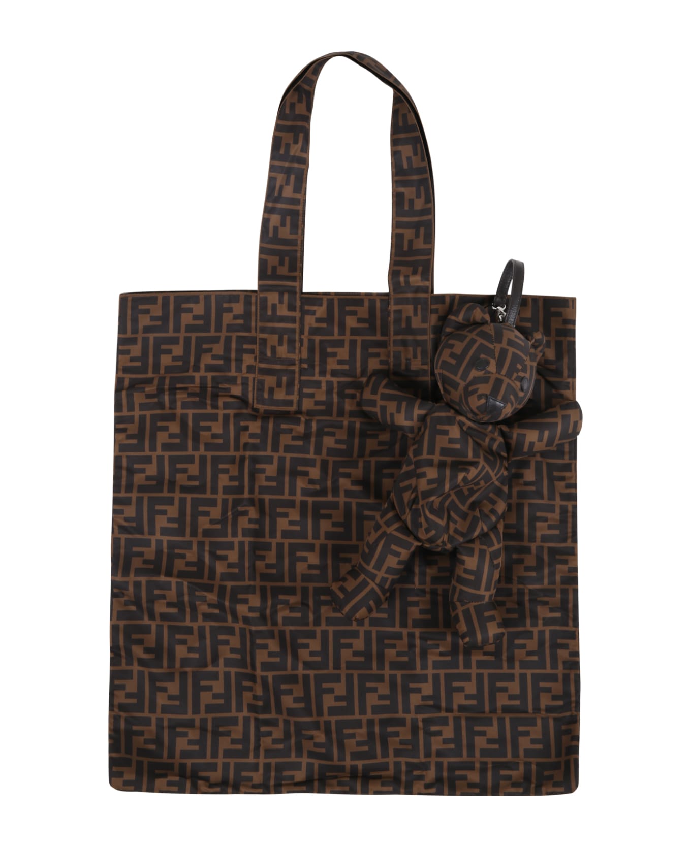 Brown shopper bag embellished with all-over double black FF, it can be closed inside the bear with zip closure, on the back.