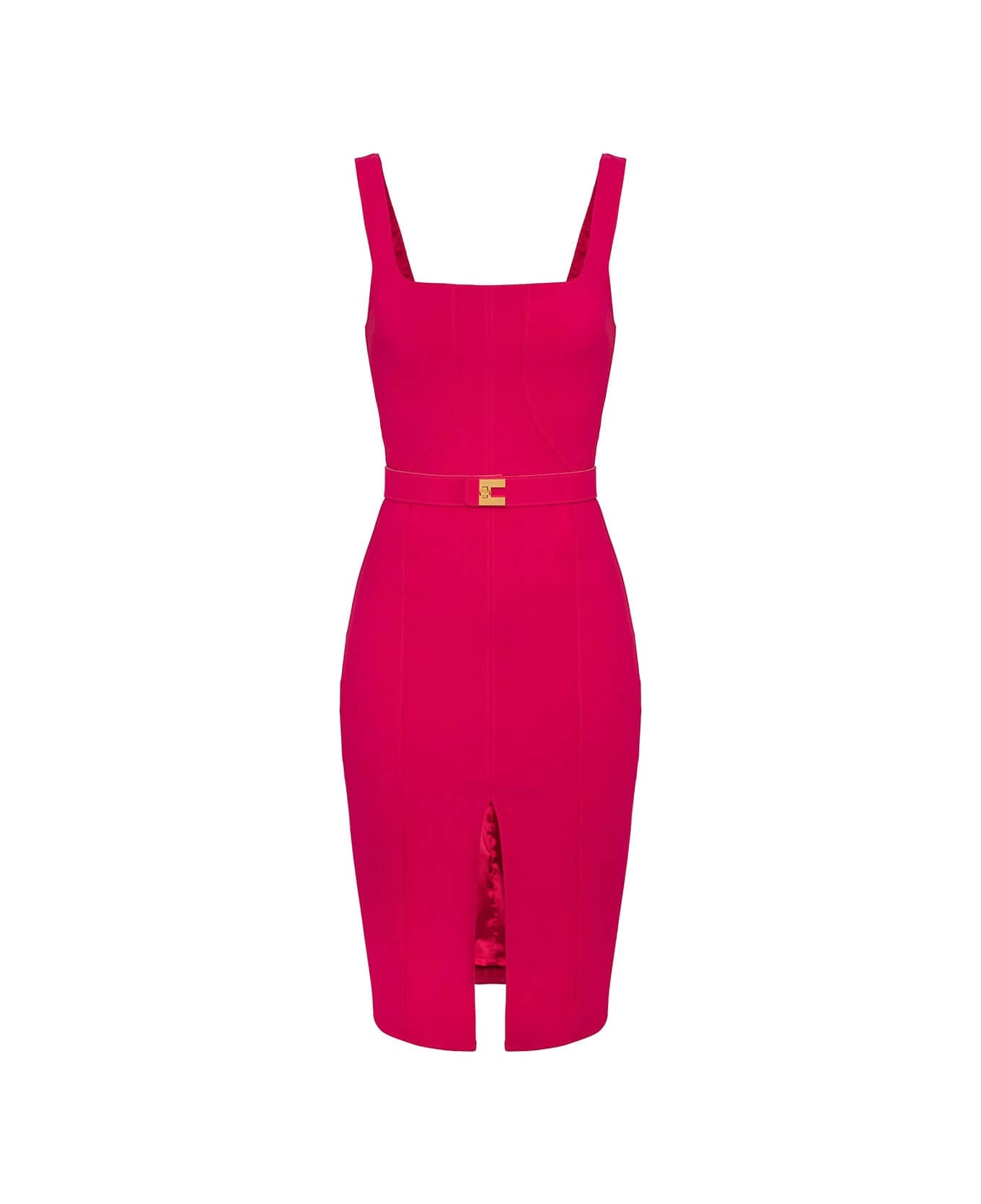 Elisabetta Franchi sheath dress made of fuchsia stretch double crêpe. Lined interior, wide square neckline and belt with golden logo to emphasize the waist. Central vent and zip closure on the back. Tight fit.