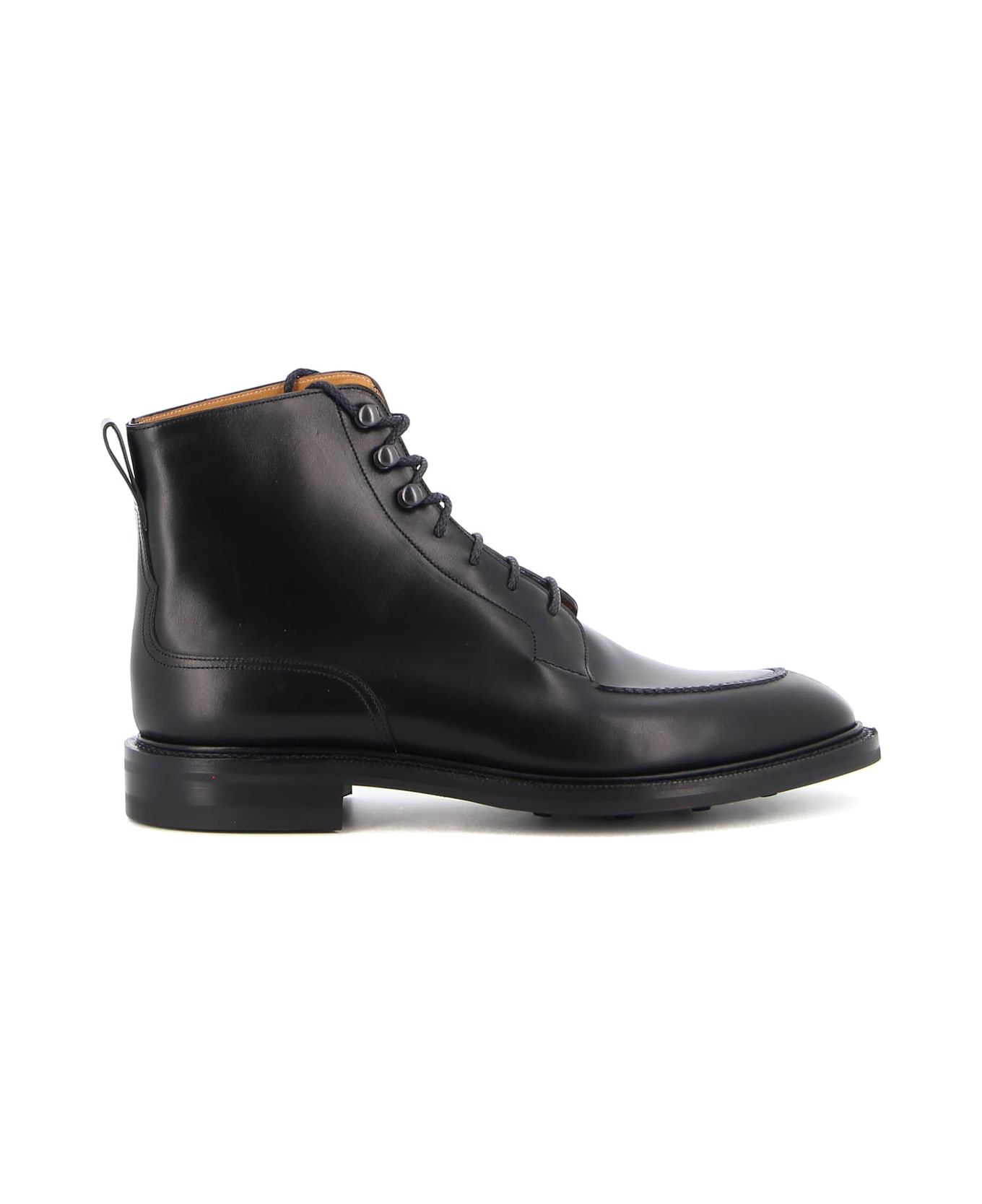 Edward Green Black leather boot, leather interior, lace-up closure, metal details, back pull, dainite soles, handmade stitching.