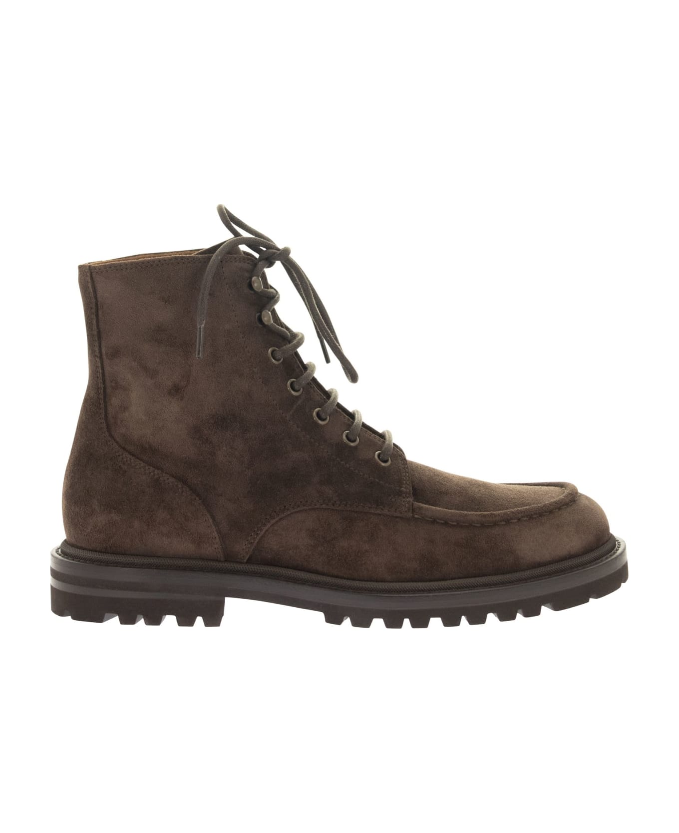 Refined materials and casual details reinterpret the elegant style of these oiled suede Boots. The leather is manufactured to have a soft, compact texture characterized by slight touches of light and dark shading. The tapered silhouette and the moccasin stitching on the toe balance the sporty touch of the detailed rubber welt and the lug outsole. A lightweight rubber and leather bottom provide added comfort. - Round waxed fabric laces - Extra round waxed fabric laces - Leather lining - Sole in leather and lightweight expanded polyurethane DESIGNER ID: MZUNETG816 C8138 Composition: Upper: Leather Lining: Leather Sole: Rubber
