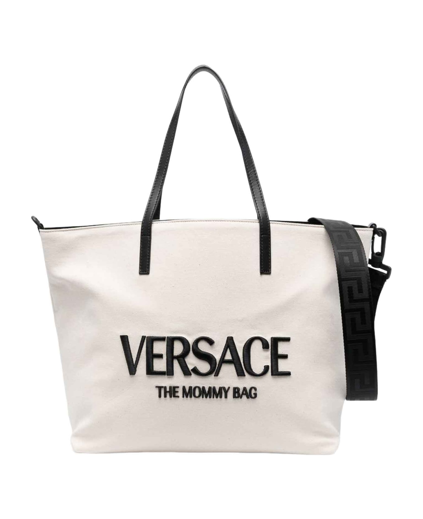 beige bag unisex. Canvas, front logo embroidery, two long handles, removable shoulder strap, single compartment and inside zip pocket. Calf Leather 100%, Cotton 100%