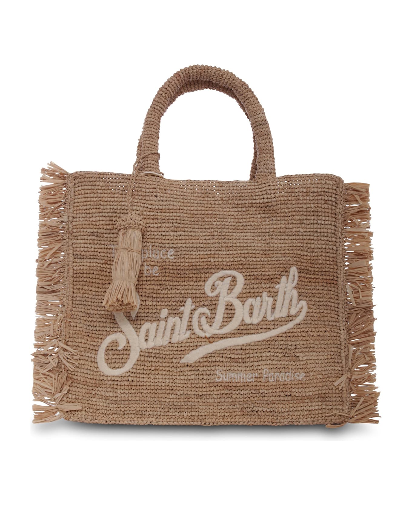 Beige raffia beach bag, with handles, tassel and fringed edges. It is embellished with an embroidered logo on the front. This item is handcrafted with natural raffia. Each bag is entirely hand-woven, any imperfections and irregularities testify to the special craftsmanship.