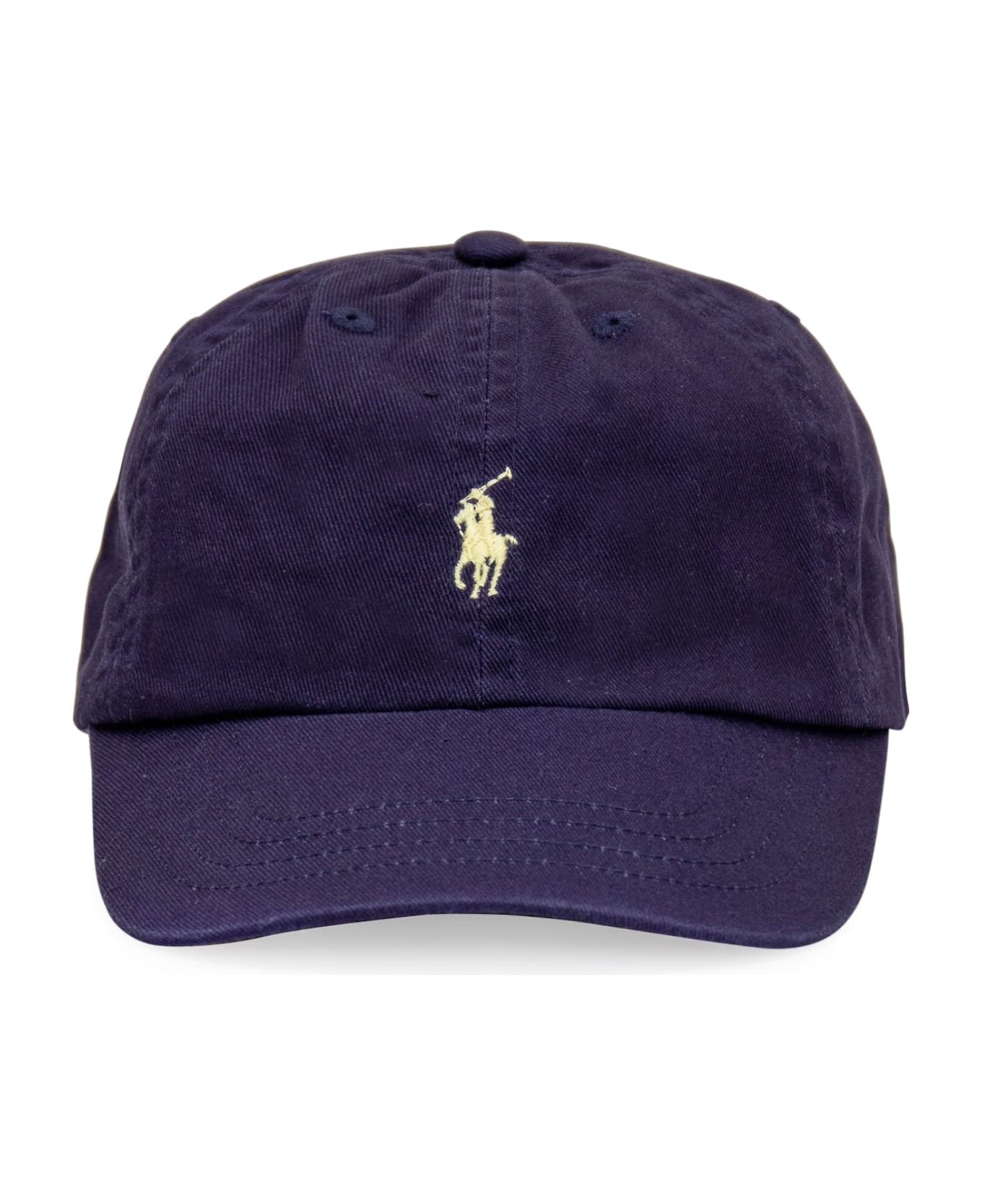 Blue cap. Curved visor. Strap on the back. Embroidered logo on the front.