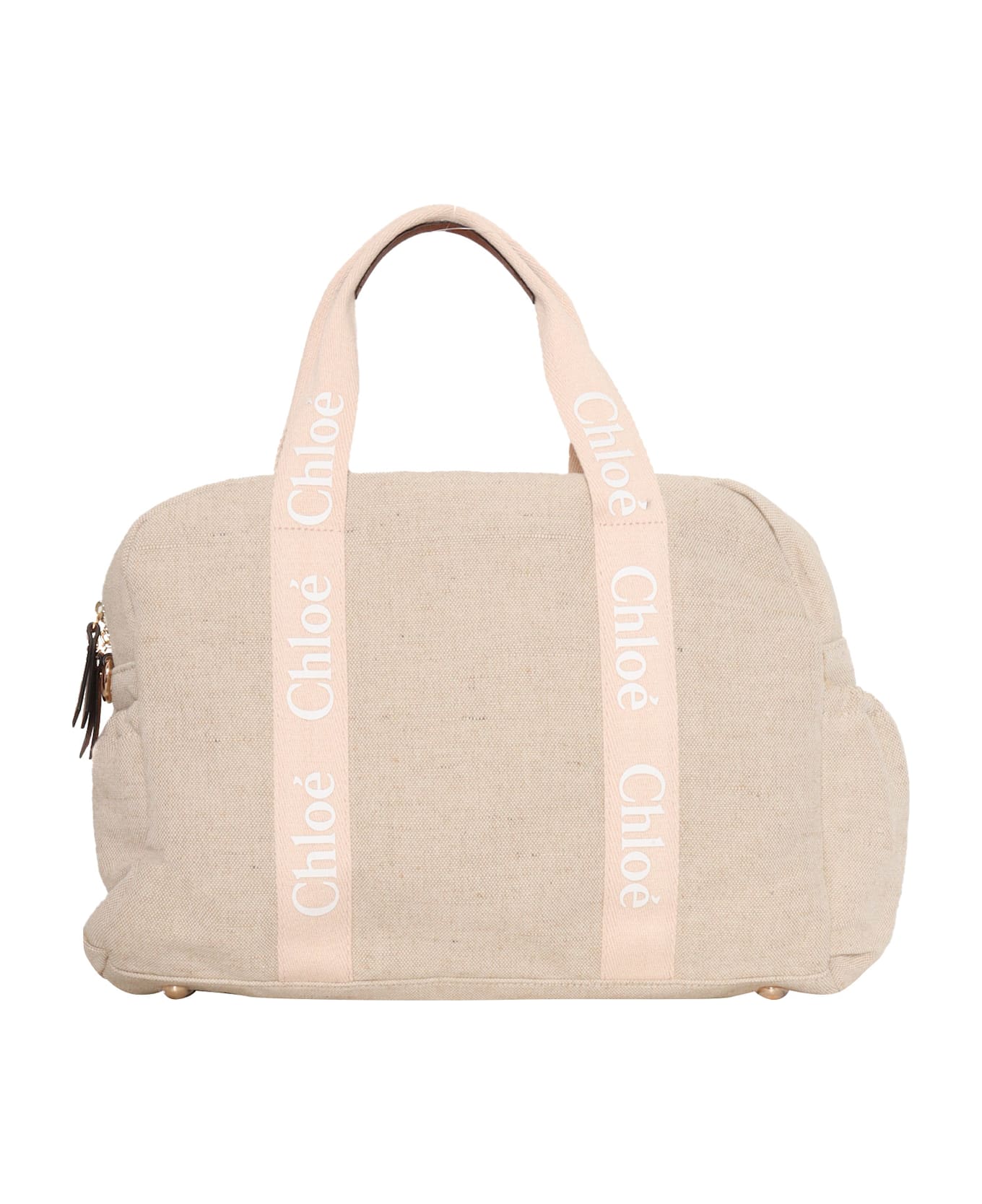 Changing bag in jute and cotton, cotton twill lining, cow leather detail, top zip closure, front and sides pockets, Chlo print on side webbing tapes. Sold with a pouch, top zip closure, Chlo branded badge on front. Dimensions : L41cm x W15cm x H30cm. Handle length : 83cm