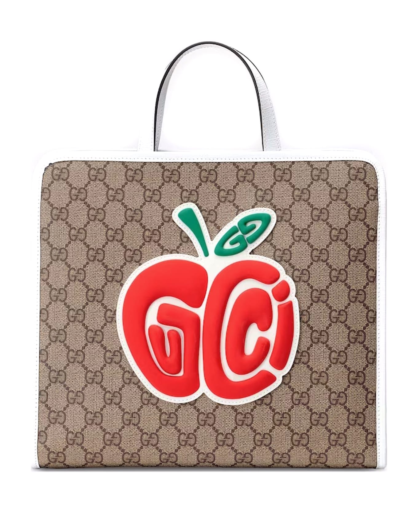 Children's GG Tote Bag With Patch, Beige and ebony GG Supreme canvas, White trim, Gucci apple patch, Nylon lining, Interior open pocket, Double handles with 8. 5cm drop, Magnetic snap button closure, W28. 5cm x H25cm x D11cm
