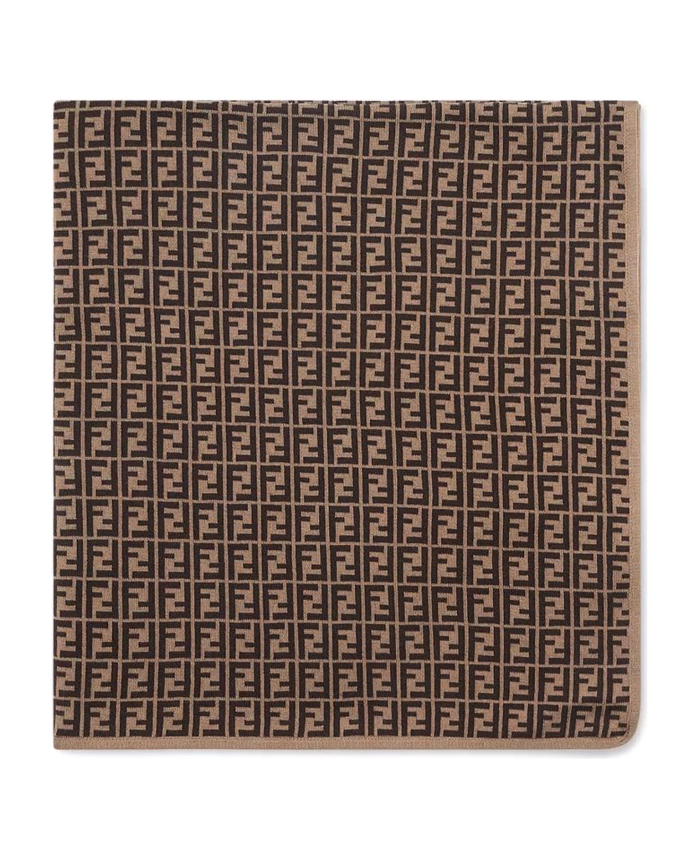 80 x 80 cm cotton and cashmere knit baby blanket with contrasting tobacco-coloured, inlaid, all-over FF logo. Composition: 85% Cotton, 15% Cashmere