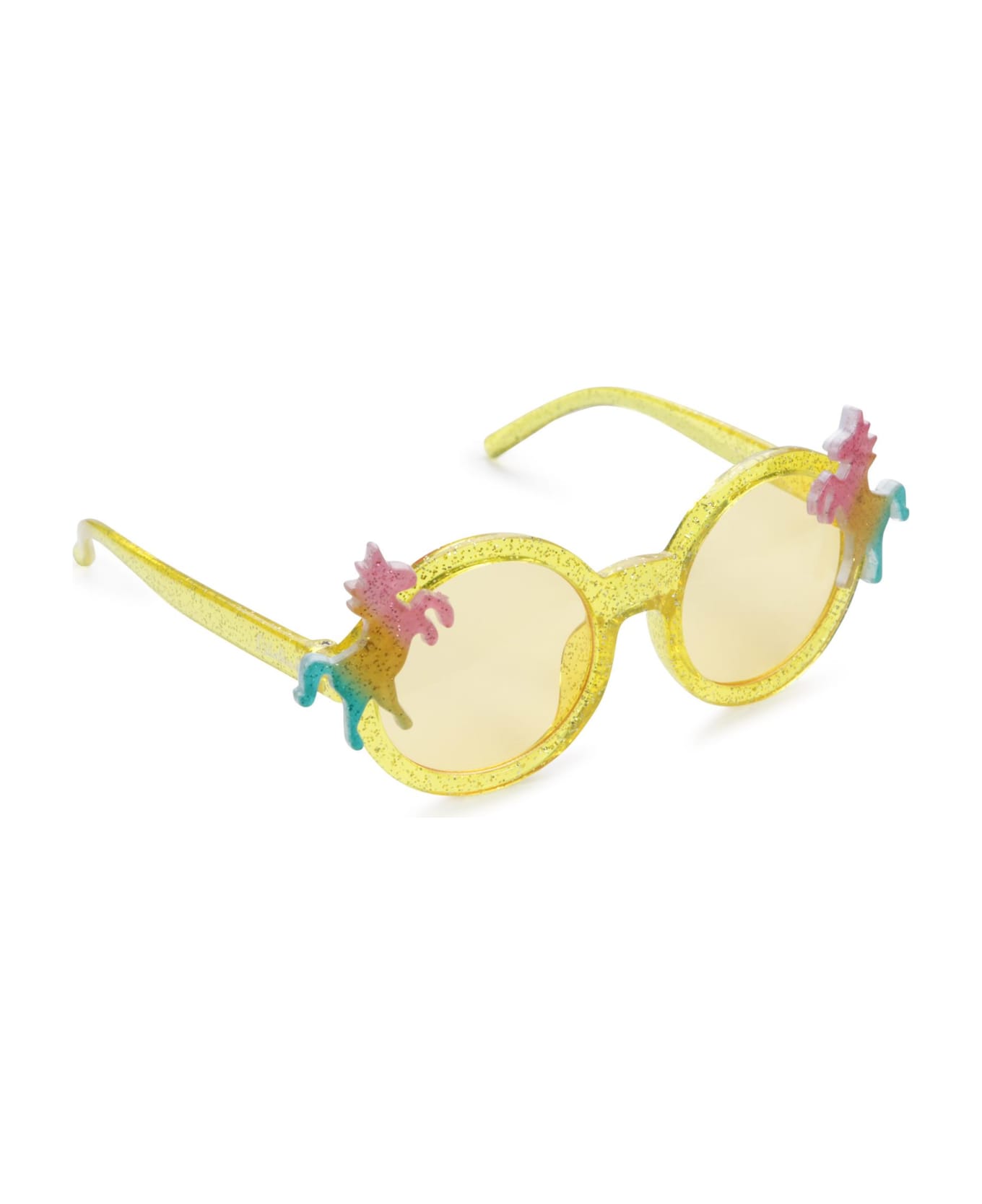 Round yellow sunglasses with yellow lenses. They are embellished with multicolor unicorns and logo. 100% Acrylic.