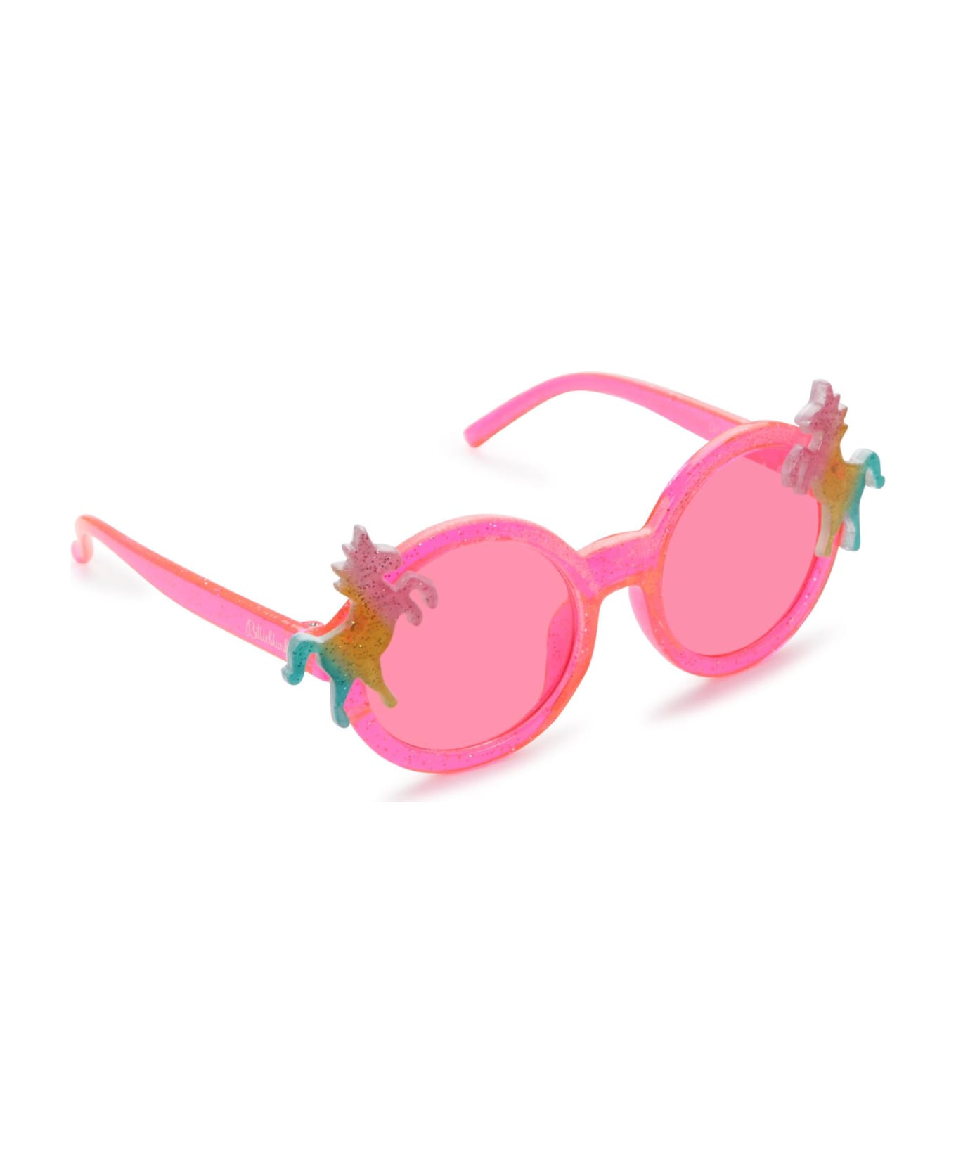 Round pink sunglasses with pink lenses. They are embellished with multicolor unicorns and logo. 100% Acrylic.