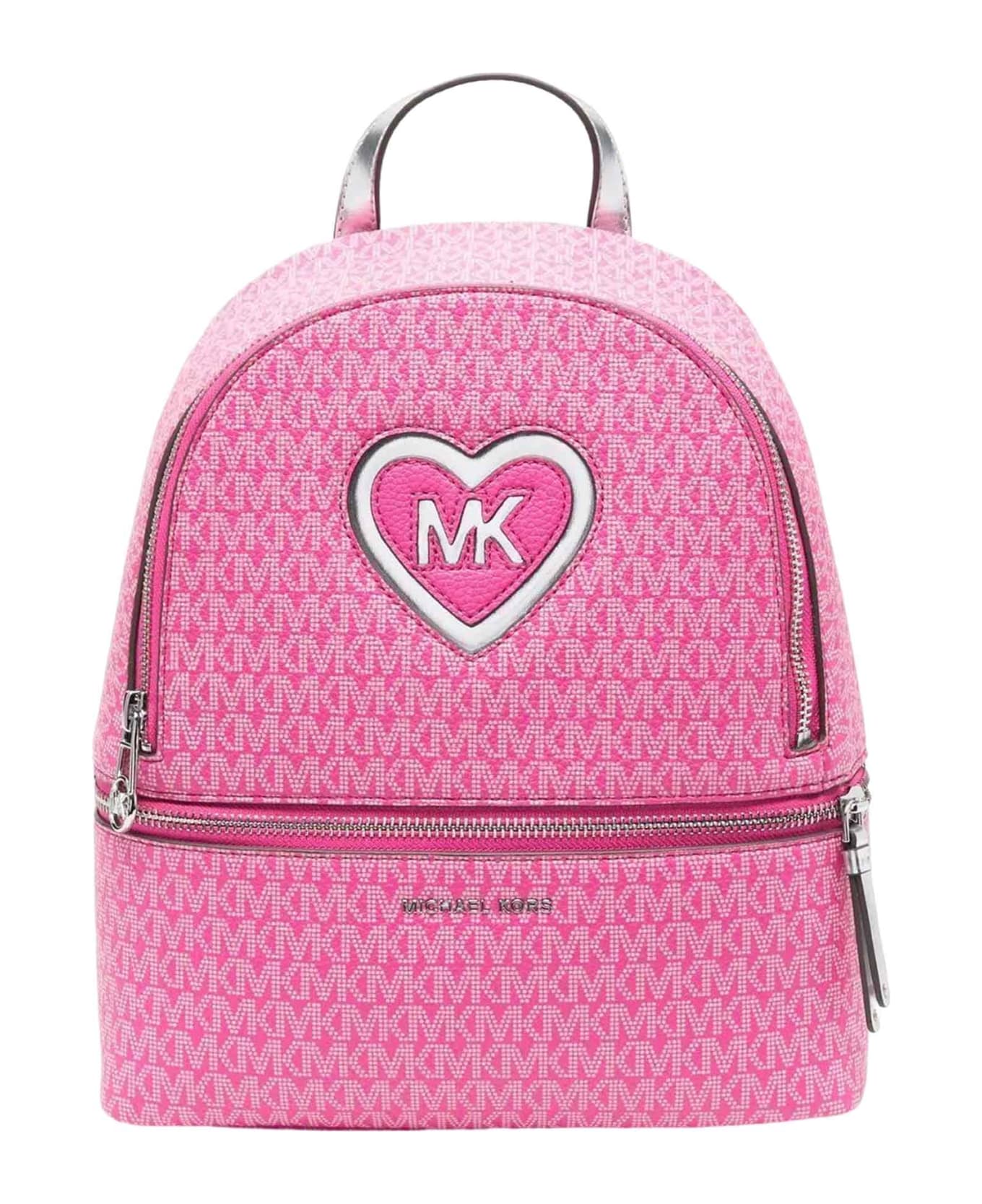 Fuchsia backpack girl. Monogram print, silver-tone letter logo, silver-tone logo plaque, front zip pocket, two logo shoulder straps, flat top handle, top zip closure and main compartment. 100% polyurethane