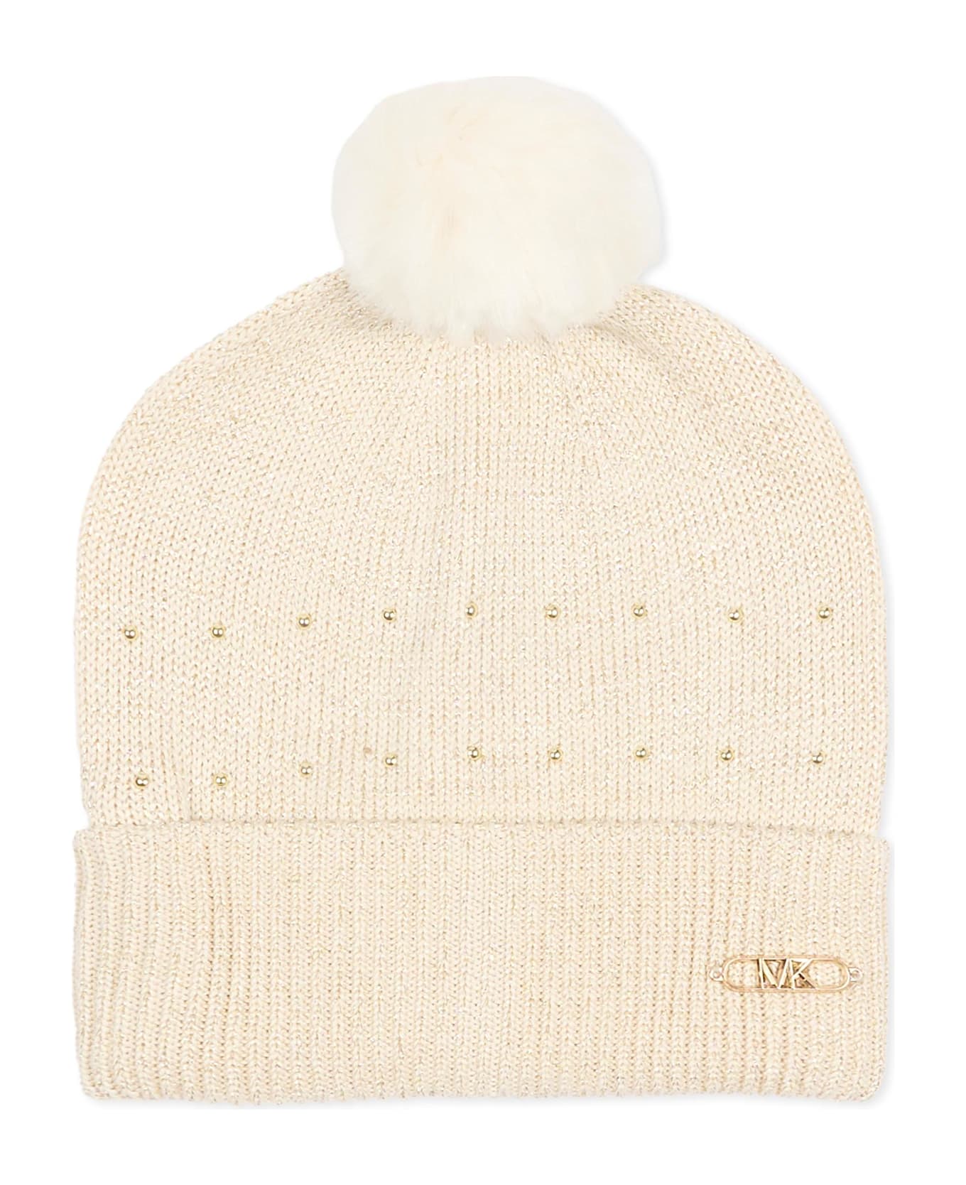 Gold hat with cuff and pompom. It is embellished with a metal logo and studs.