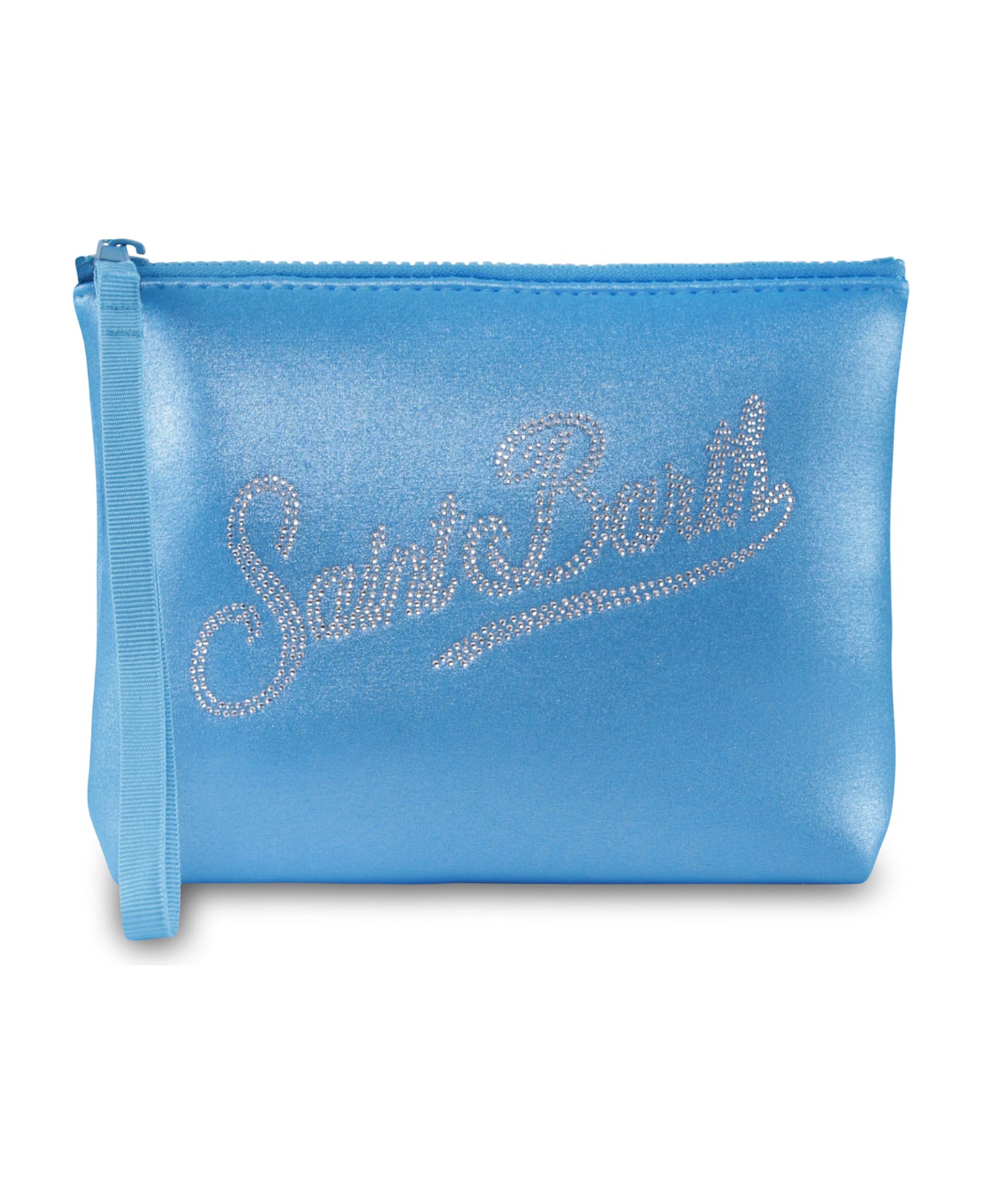 Light blue clutch bag in scuba fabric, with handle and top zip closure. It is embellished with rhinestone logo on the front and back.