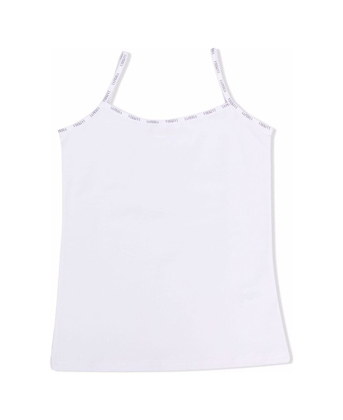 logo-print vest top from LA PERLA KIDS featuring rose pink, cotton blend, jersey knit, logo-print edge, thin shoulder straps, scoop neck, scoop back and straight hem. Composition: Cotone, 94% , Spandex/elastam, 6%