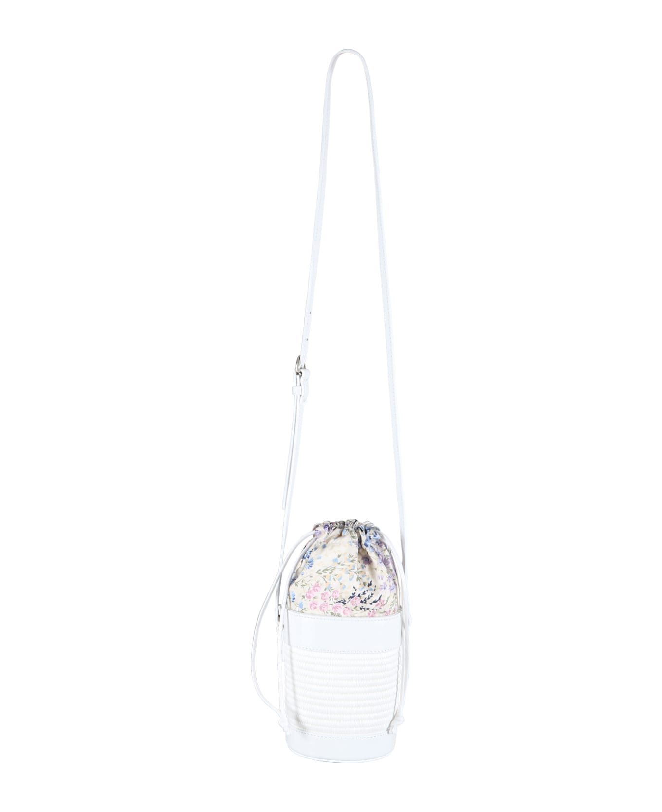 White bucket bag, made from leather, with drawstring closure and shoulder strap. It is embellished with print.