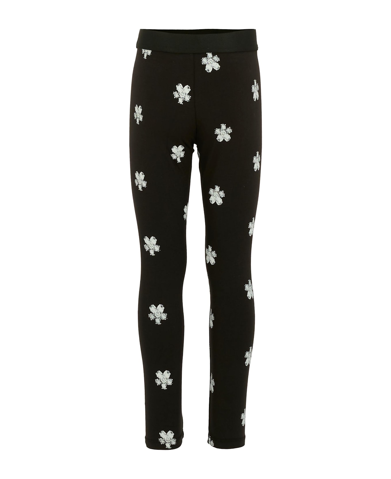 Black leggings with an elasticated waist; they are embellished with a rubber logo on the front and an all-over floral print.