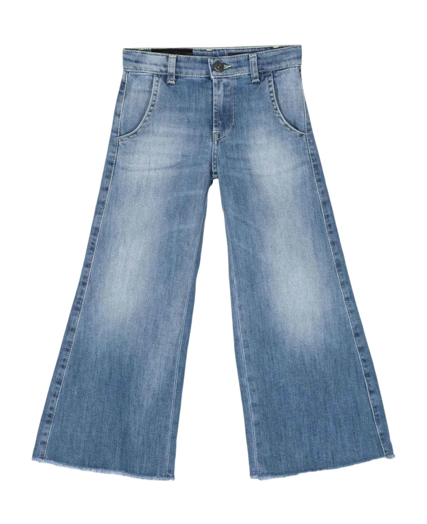 blue jeans girl. Back application with logo, front closure with buttons and zip, two round side pockets, two shaped back pockets and wide leg fit. Cotton 89%, Polyester 11%
