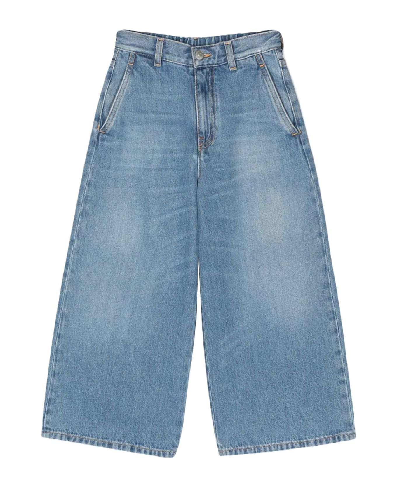 blue jeans unisex. Logo patch on the back, belt loops, concealed flap and button fastening, two diagonal side pockets, back elastic waistband, back patch pocket and wide leg. 100% Cotton
