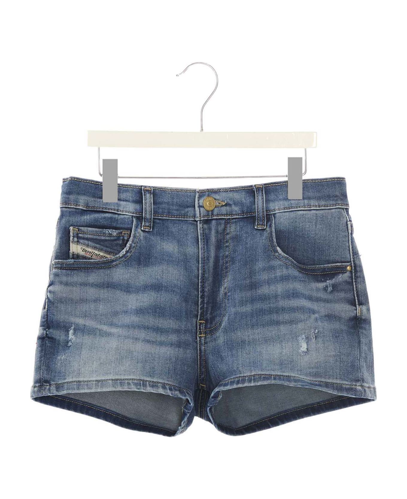 Stretch cotton denim shorts with used effect details, a zip and button closure, five pockets, and a logo tag at the back. Composition: 62% cotton 16% polyester 13% lyo 9% elastane