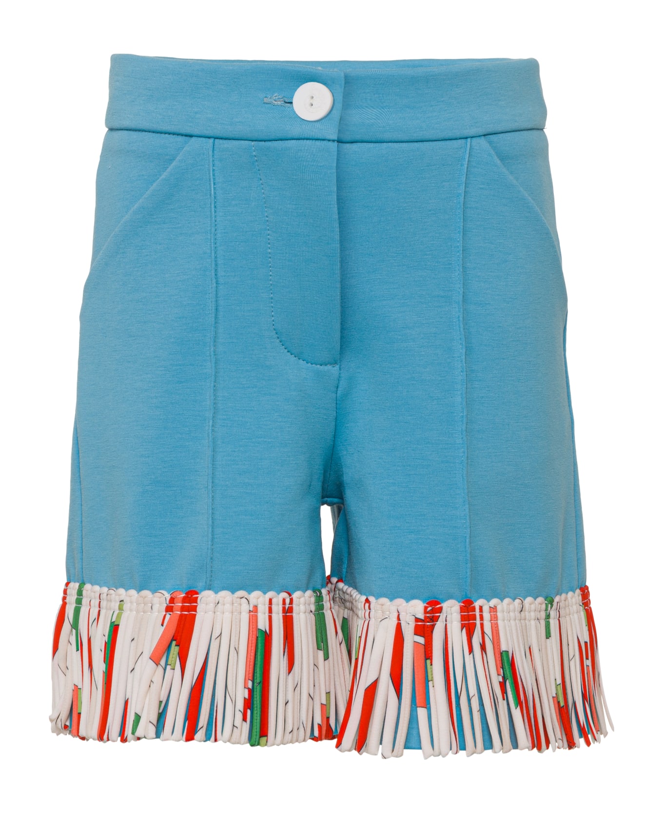 Blue, multicolor, ruches detail, front closure with buttons and zip and two side welt pockets. Composition