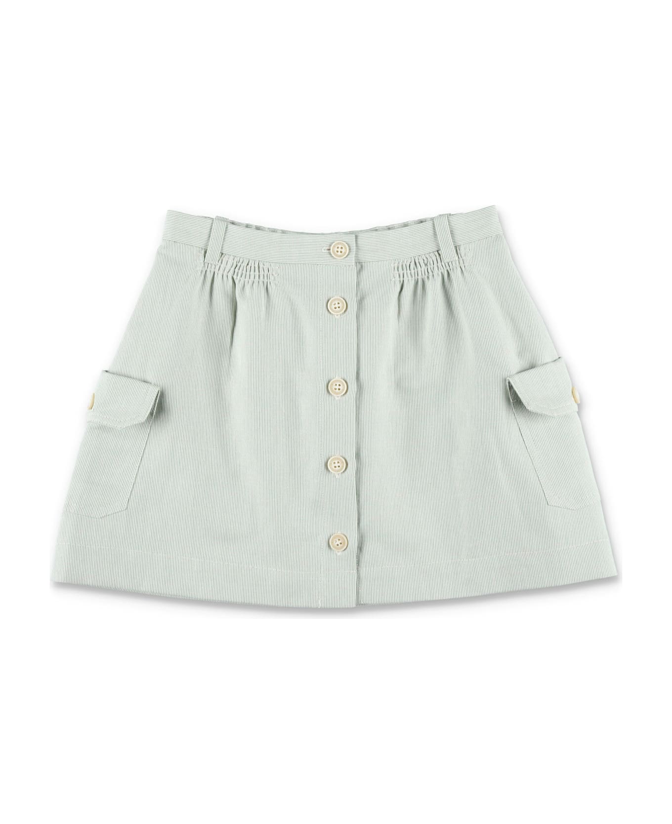 Cotton And Linen Blend Génèse Skirt By Bonpoint. Featuring: Front Buttons Closure Belt Loops Small Panel Of Smocking Below The Waistband At The Front And Back Flap Pockets On The Sides Flared Cut