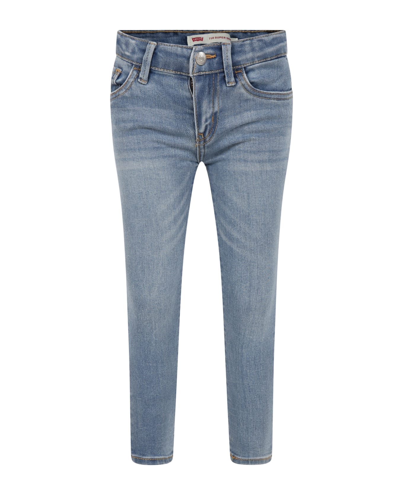 Light blue denim jeans, five pockets, with belt loops, zip and button closure, adjustable waist thanks to internal elastic bands. They are embellished with logo patch on the back.