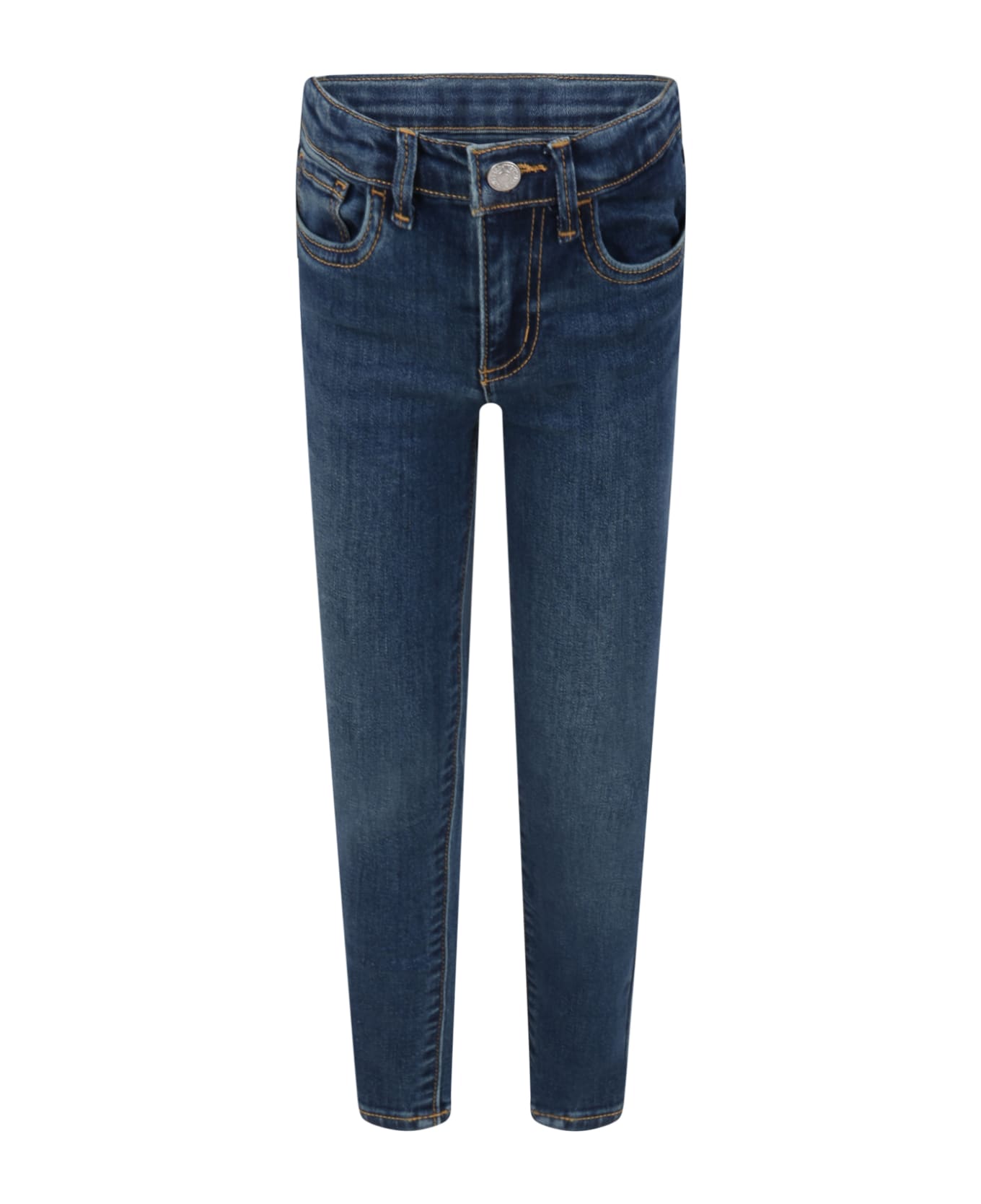 Denim light blue five-pocket jeans, washed-out effect, with loops for five, adjustable waist thanks to the inside elastics with button and hook and zipped closure, on the front. It s embellished with loged patch, applied to the back.