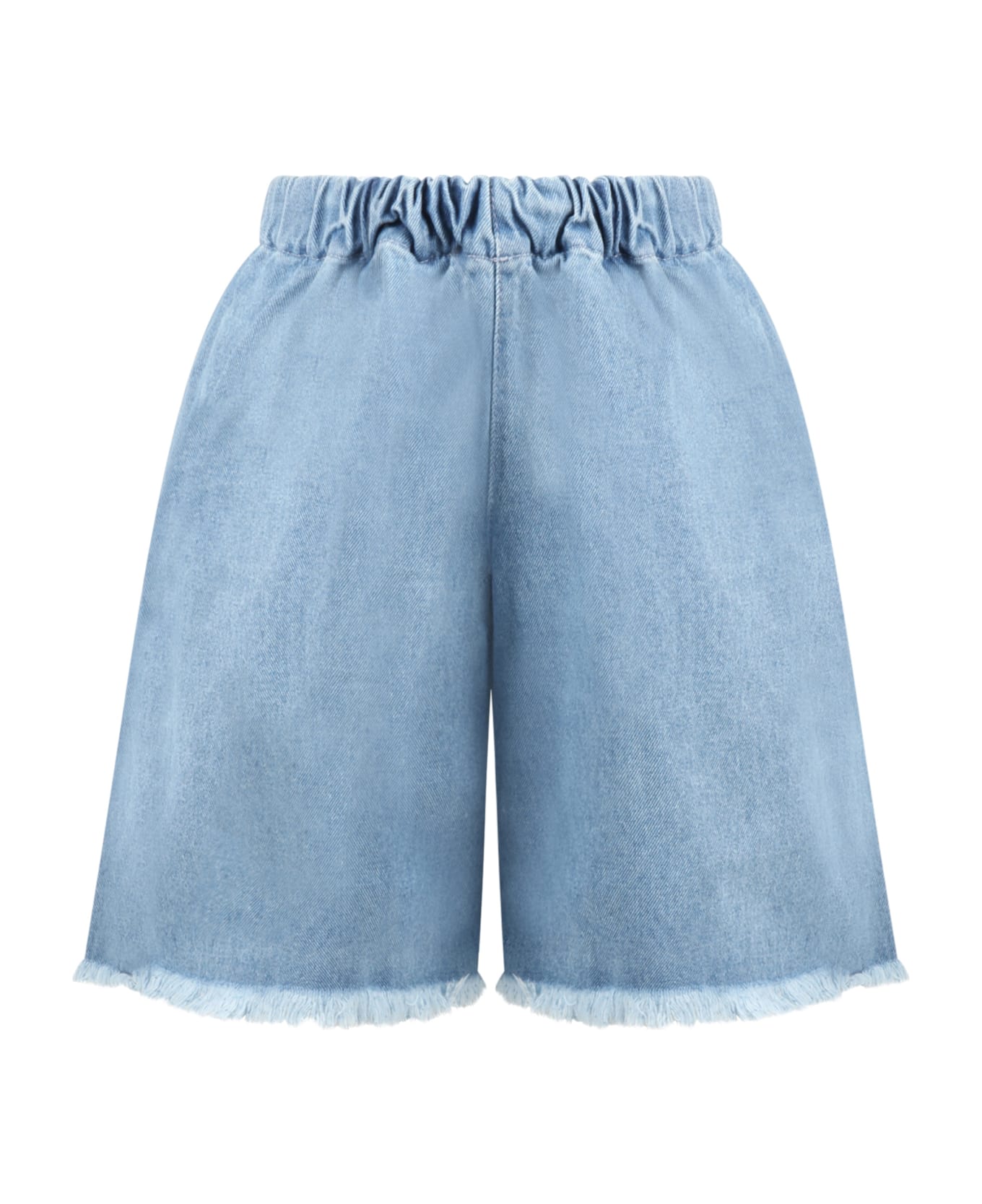Light-blue denim shorts with elasticated waistband and side pockets. They are embellished with yellow logoed patch on the back.