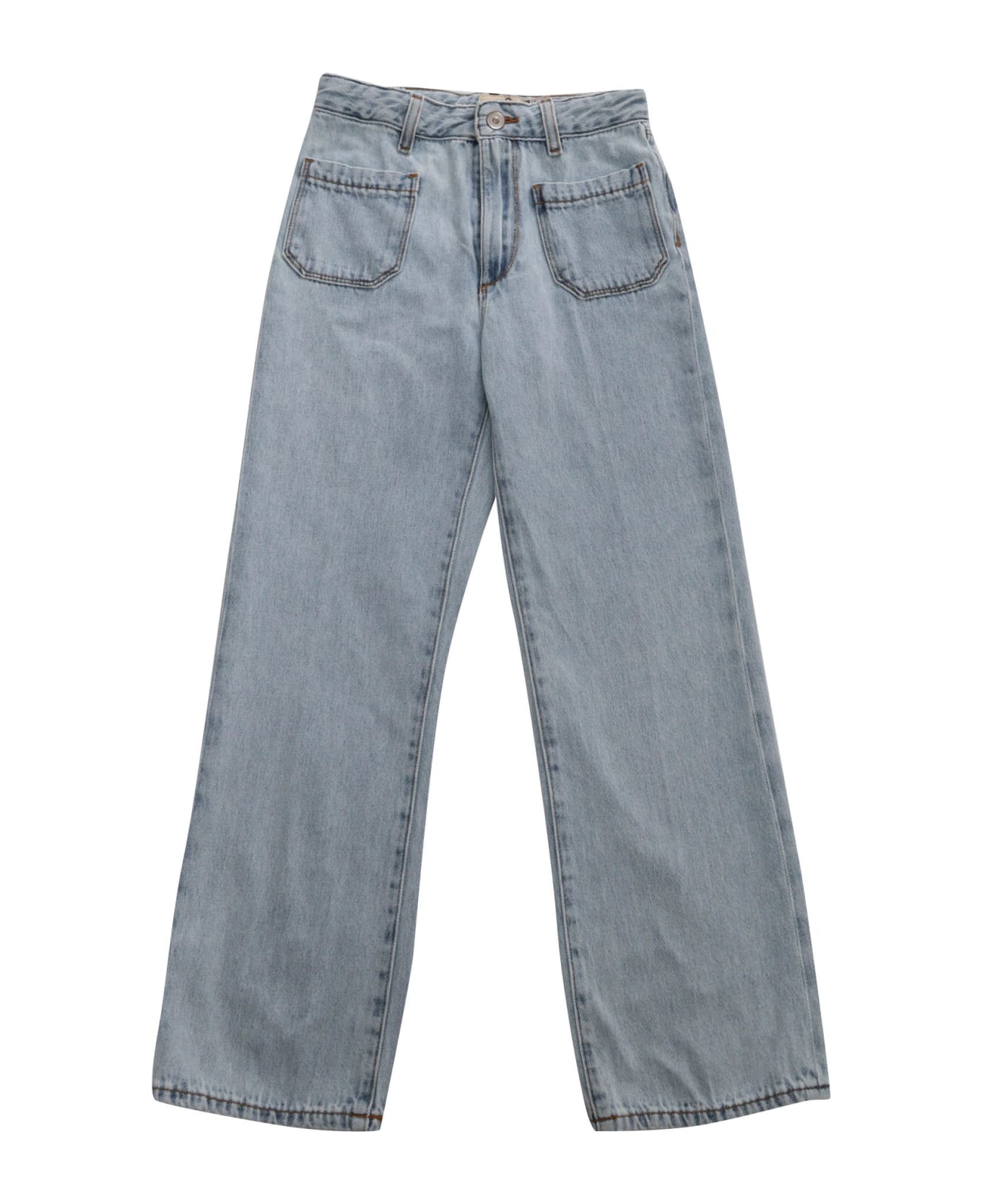 Wide jeans in stretch denim, stonewashed, front patch pockets, belt loops, back patch pockets