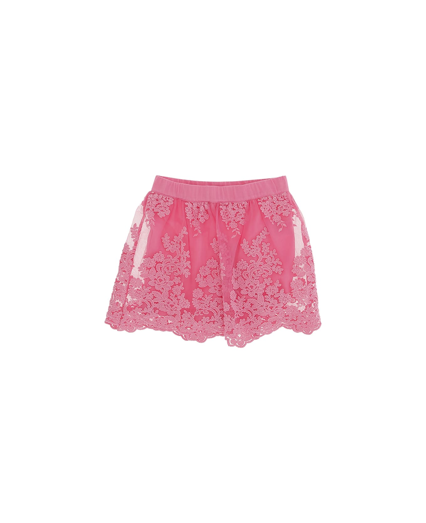 Ermanno Scervino Junior pink flared skirt in embroidered tulle, with elasticated waist and jagged hem that follows the lace pattern. Refined tone-on-tone floral embroidery embellishes the model.