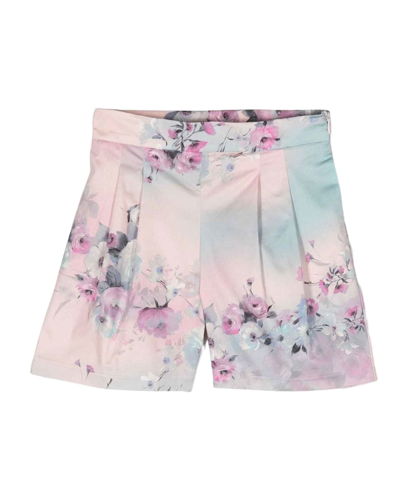 pink shorts girl. Tie dye pattern, flower print, pleated design, high waist and above knee length. Cotton 97%, Spandex/Elastane 3%
