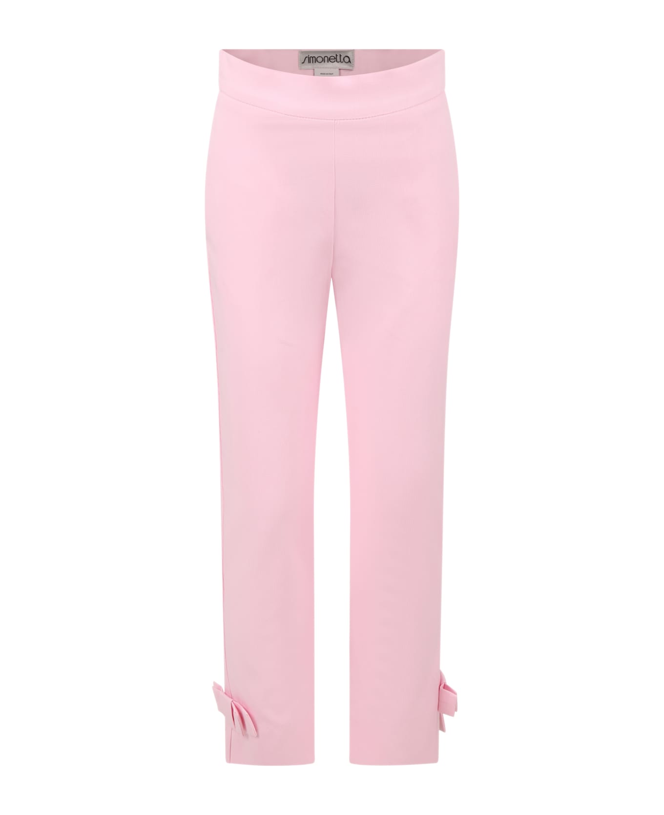 Pink trousers, with side zip closure, adjustable waist thanks to an internal elastic with button, side pockets. They are embellished with bow on the sides.