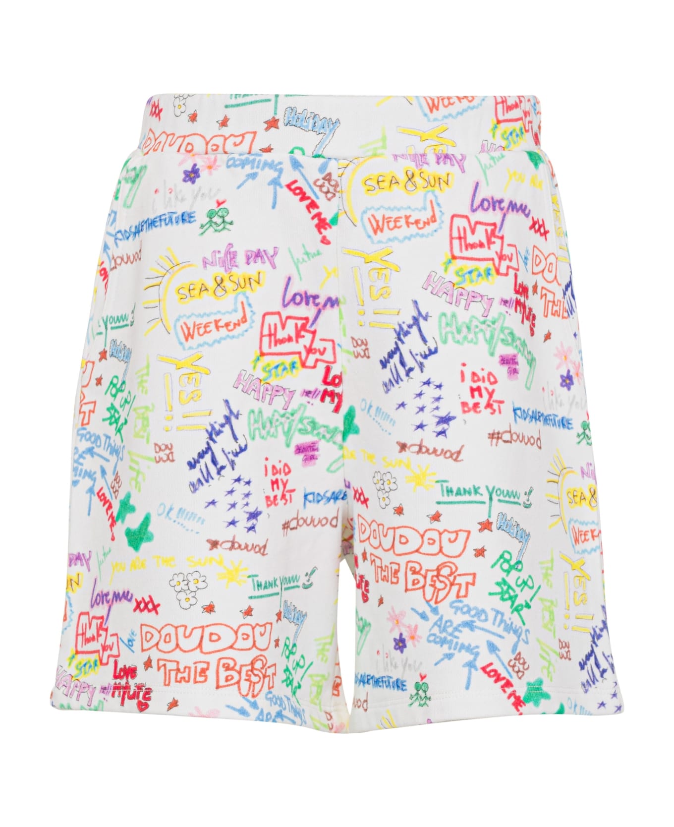 White/multicolor, cotton, all-over logo embroidery, elasticated waist, two front pouch pockets and straight hem. Composition