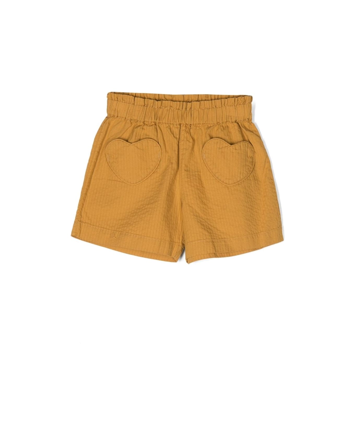 Mustard yellow, cotton, vertical striped pattern, heart patch, elasticated waist and two front patch pockets. Composition