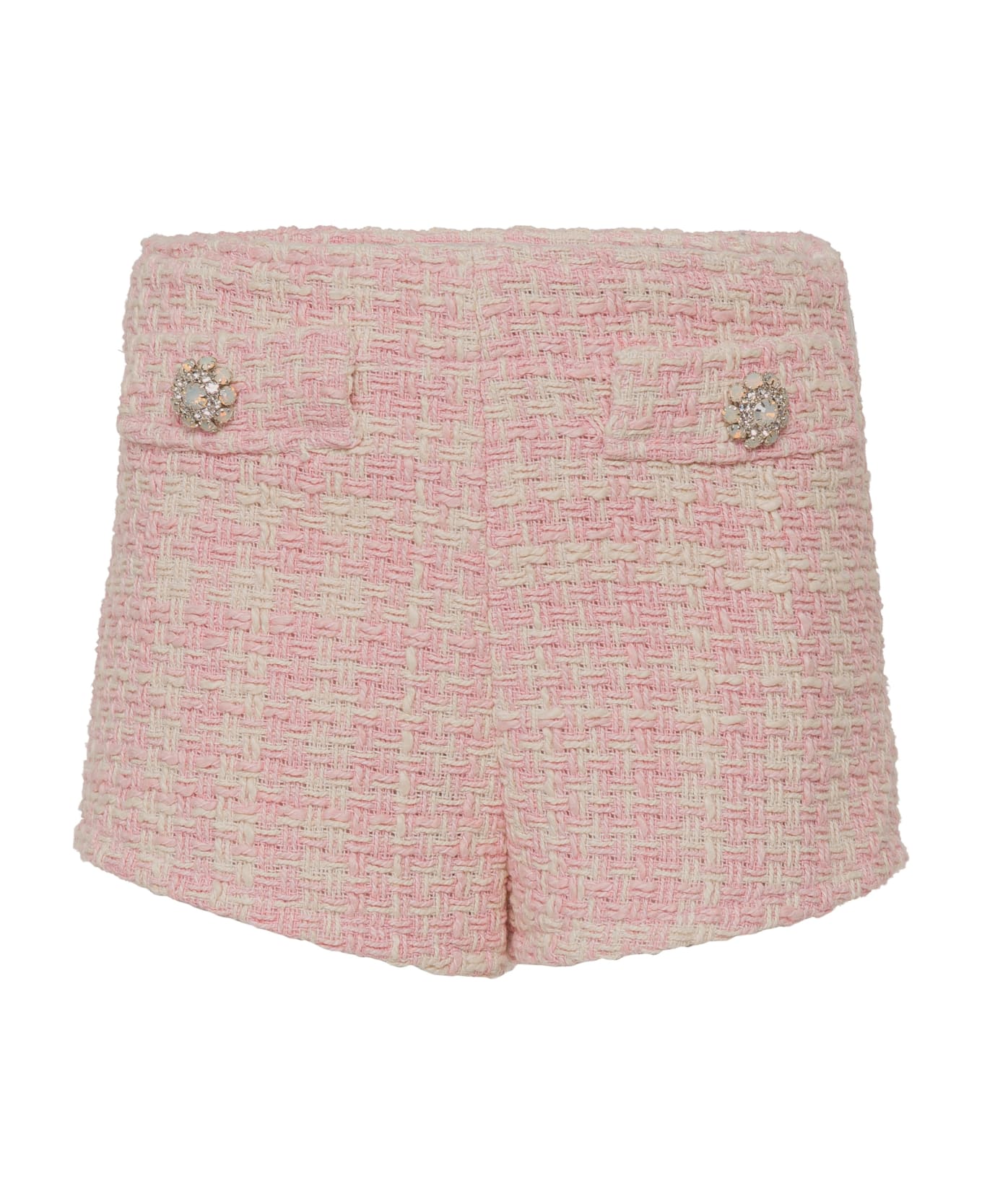 Pastel pink, matte white, cotton blend, tweed, beaded embellishment, side short zip fastening and above knee length. Composition