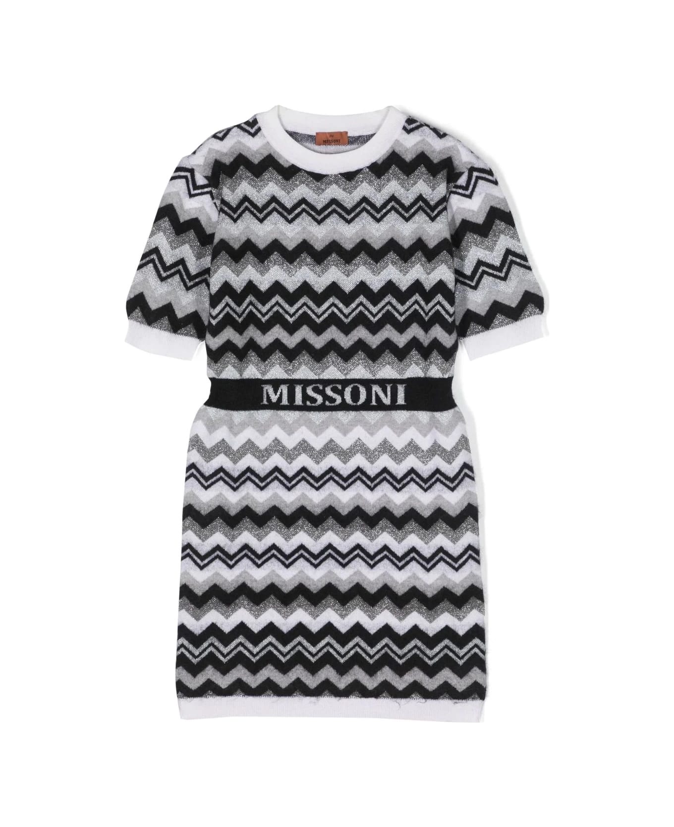 Missoni Kids dress in white wool-blend knit with a black and grey chevron pattern embellished with silver lurex yarn. It features a crew neck, short sleeves, ribbed trim and a knitted waistband finished with a contrasting inlaid logo.