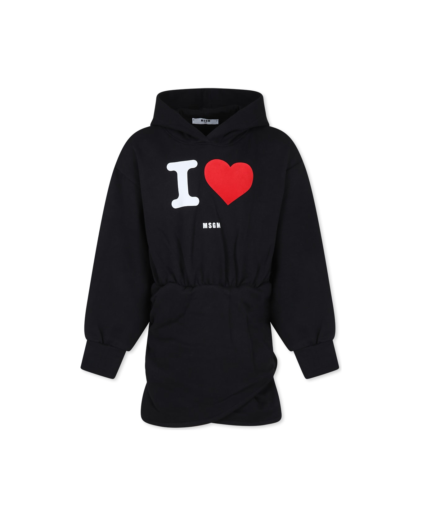 Black dress in fleece cotton, long sleeves, with hood, elasticated waist, gathered sides and cuffs. It is embellished with heart and logo on the front.