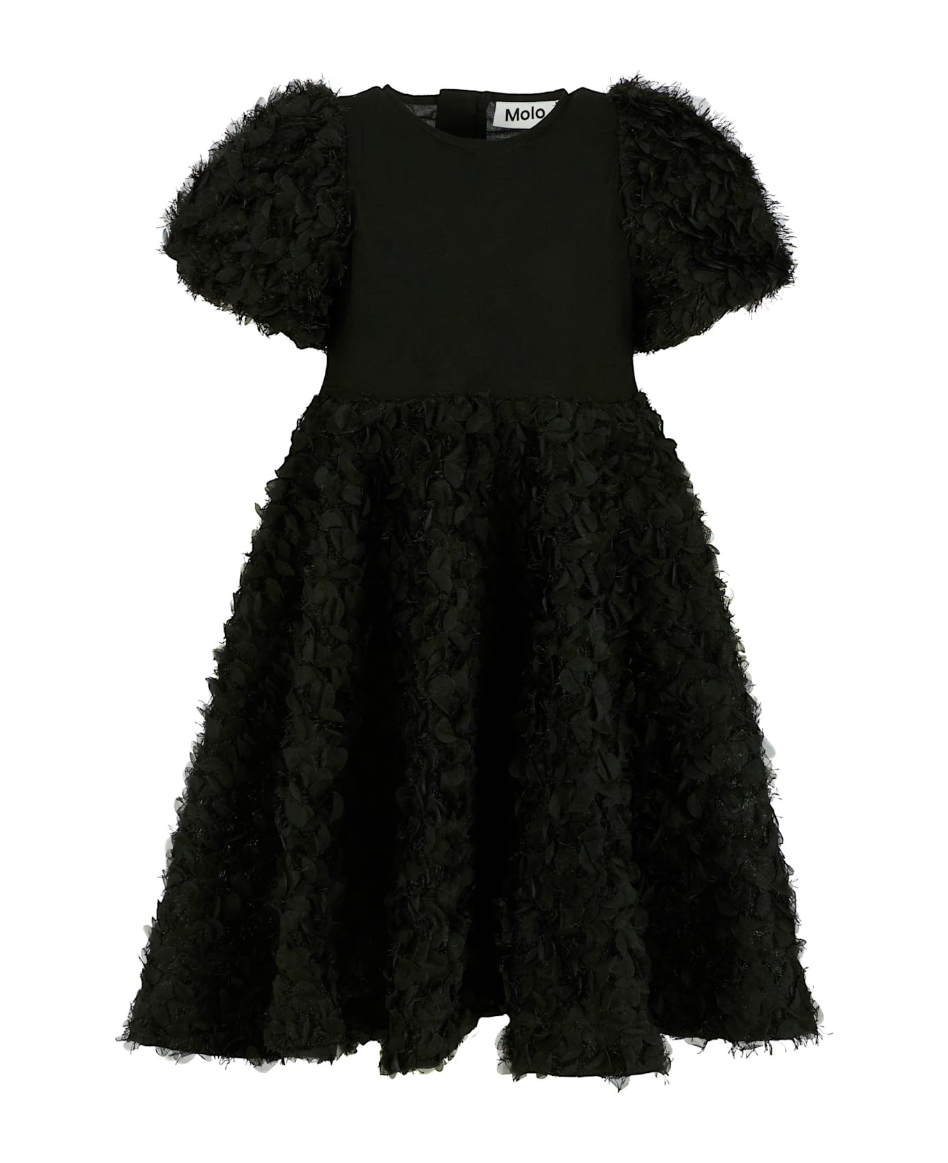 Black dress with short puff sleeves, a round neckline, a back zip closure, and a tulle bodice. It is embellished with petals and fringes, applied on the skirt and sleeves